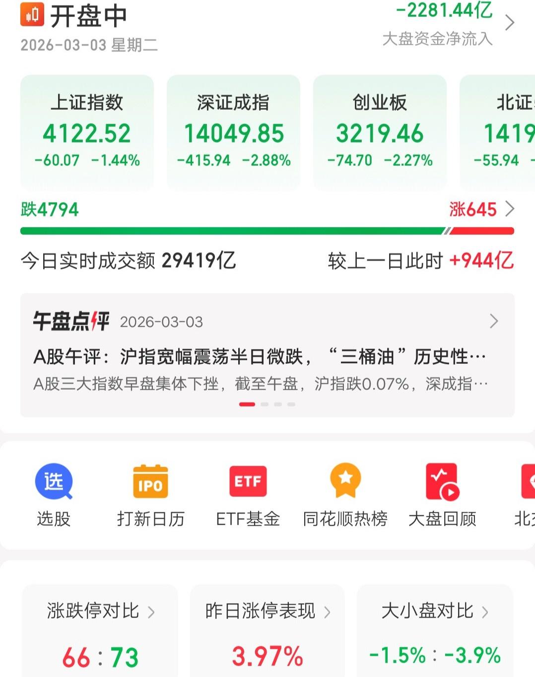 黑色星期二,不止是A股,整个亚太市场今天跌惨了,胆小的散户别看账户,严重影响心态呀。日经指数大跌3.06%,韩国综合指数暴跌7.24%,个股跌的就更难看了。印度指数跌1.33%,三哥的市场还是很坚挺的。 再看大A,沪指跌1.44%,深成指跌2.88%,创业板跌2.27%,集体跳水收绿。个股下跌家数4794家,跌停个股73家,属于小型股灾了。 港股也好不到哪去,恒生指数跌1.05%,恒生科技跌2.31%。 问题来了,按常理说,周末发生的利空,周一应该跌的最狠,怎么今天比昨天跌的还要惨呢,到底是谁在卖。 主力昨天砸钱稳住了恐慌情绪,散户预想的股灾并没出现,于是松了一口气,没想到今天再度闷杀。只能说,主力技高一筹,预判了散户的预判。 地缘冲突向来是股市的头号杀手,稳妥起见,还是等形势明朗吧,仓位要合理。
