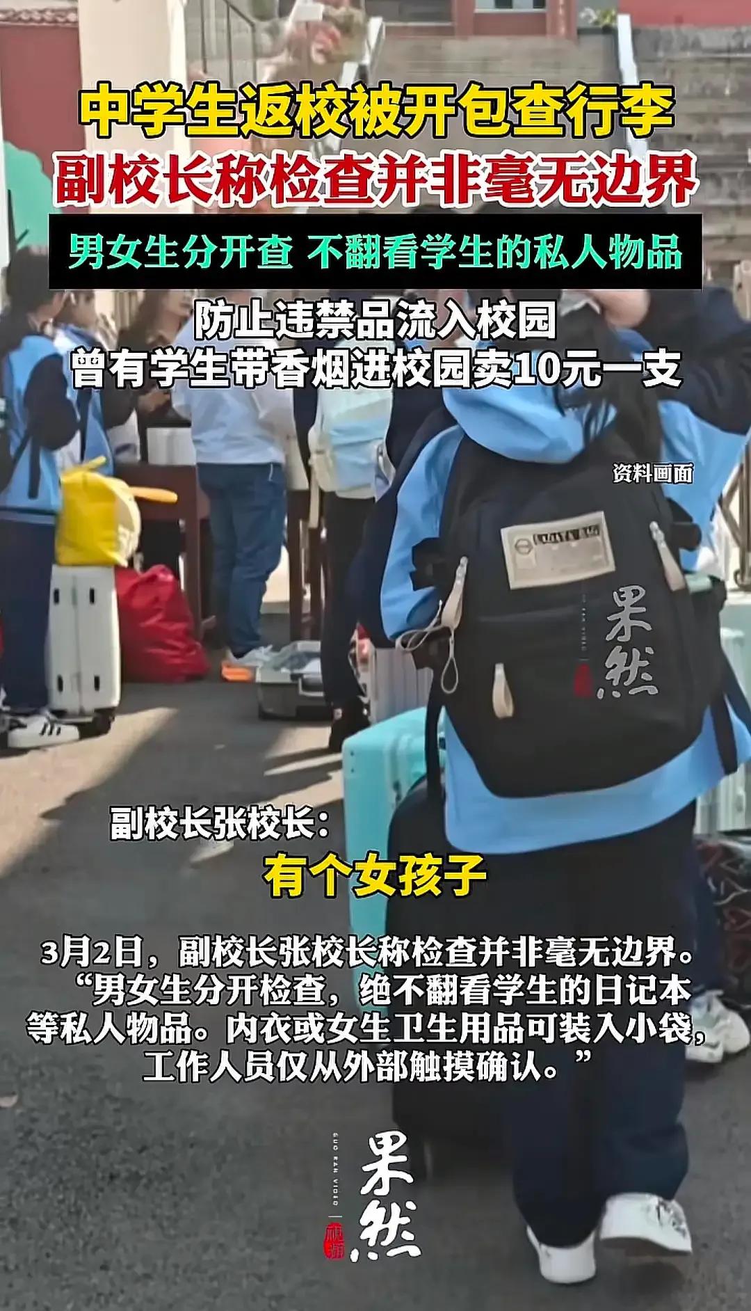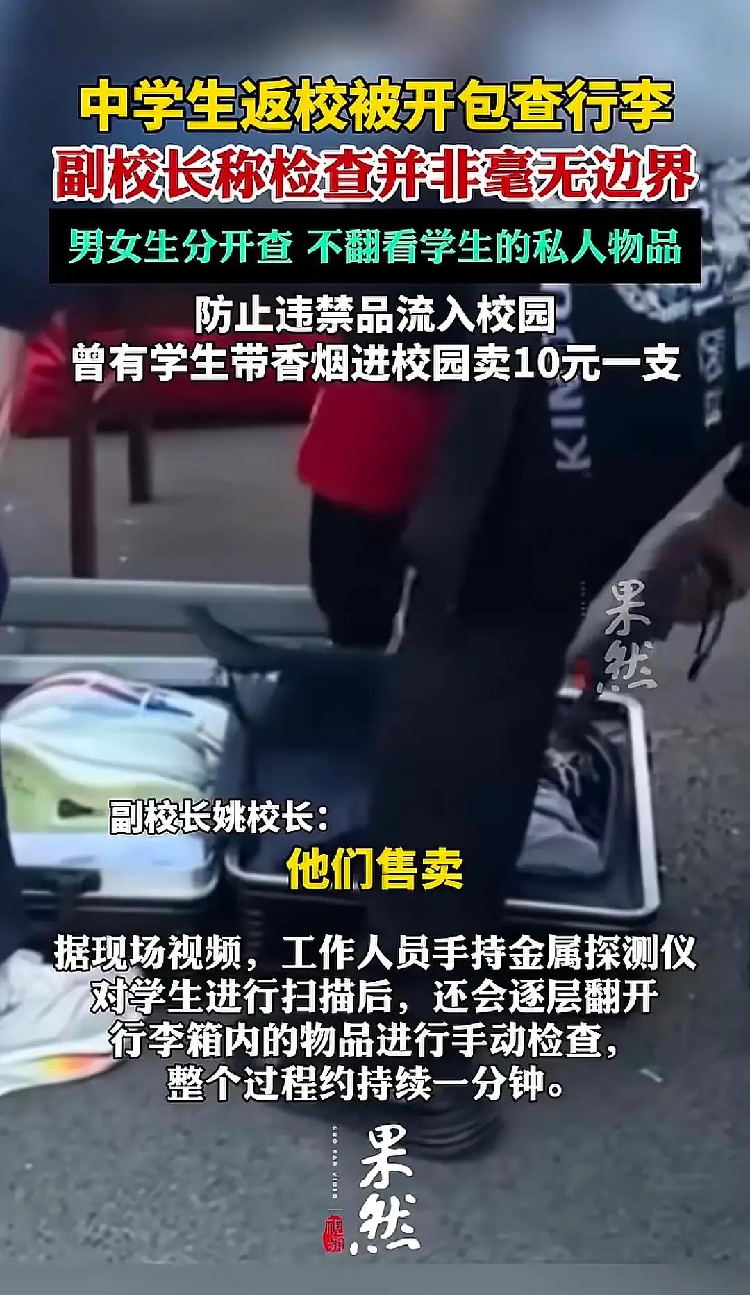 贵州某中学开学返校,学生被开包搜身,有家长怒了!学校回应:为了安全!网友一边倒:全力支持学校! 开学返校竟被学校开包检查+金属探测仪扫描,贵州某中学的这一波操作,引起部分家长的质疑:这不是侵犯孩子隐私吗? 视频里的画面很直观,校门口的空地上,学生们按顺序排队,工作人员拿着金属探测仪在他们身上扫描,另一些人则蹲在地上,仔细翻看学生的书包和行李箱。有家长看到后觉得不妥,认为孩子也是独立的个体,这样的检查方式太强硬,折损了孩子的自尊,也触碰了隐私的边界。 但网友们的态度却出奇一致,几乎是一边倒站在学校这边,这背后藏着太多让人后怕的现实案例。大家都没忘那场校园火灾,学生不幸遇难,负责监管的老师最终被判刑,那是活生生的教训。安全事故一旦发生,带来的就是无法挽回的伤痛,没有任何家庭能承受这样的代价。 学校的回应也印证了担忧并非多余,安全副校长直言,校内曾出现学生带香烟进校倒卖的情况,一支能卖到10块钱,除此之外,打火机、管制刀具这类危险物品,也可能被学生偷偷带进来。这些东西一旦流入校园,不仅会影响学生的身心健康,还会埋下巨大的安全隐患。 网友们的支持,本质上是对“安全优先”的认同。大家心里都清楚,学校这么严厉,不是为了为难学生,而是想把危险第一次就堵在校门外。青春期的孩子好奇心重,自控力相对薄弱,有些东西他们可能只是觉得新鲜就带进校园,却意识不到背后的风险。 那些质疑隐私被侵犯的家长,心情可以理解,但也得认清校园安全的严峻性。比起事后的追悔莫及,事前的严格排查显然更有意义。而且学校也强调,检查过程中会注意保护学生隐私,避开敏感部位,不会过度翻看私人用品,这种分寸感其实已经在尽力平衡安全与尊重。 校园安全从来不是一句空话,它需要实实在在的举措落地。老师的监管责任重大,一旦出事就要承担法律后果,学校的严格检查,也是在为老师减负,为学生的安全兜底。这种看似“不近人情”的严厉,实则是最稳妥的守护。 当然,如何在严格排查和尊重隐私之间找到更优解,也是学校需要思考的。但就目前而言,把危险挡在校园之外,守住学生的安全底线,这份严厉值得被理解和支持。 各位读者你们怎么看?欢迎在评论区讨论。