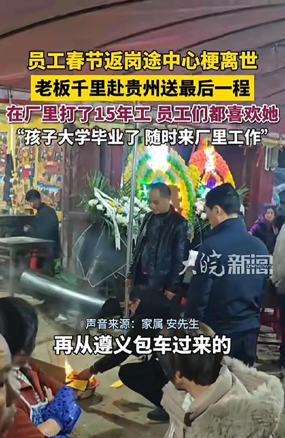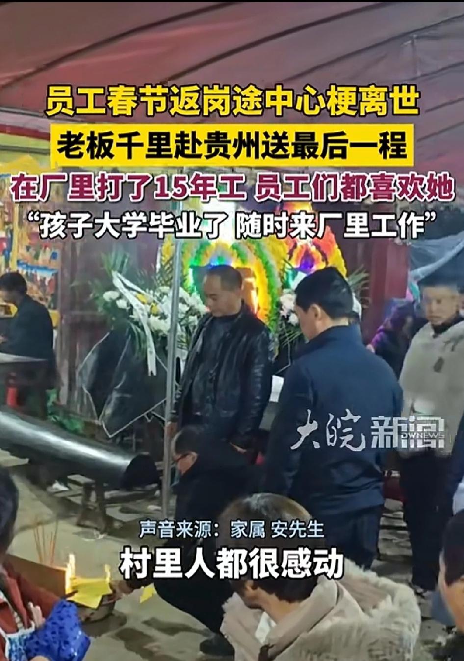 看哭全网,贵州练女士与家人自驾返厂复工,却在途中突发心梗不幸离世,没想到老板跨越千里送她最后一程,一句暖心承诺感动无数人。 2026年正月初七,2月14日,春运返程最高峰。 贵州遵义深山里的练女士,44岁,在广东中山一家医疗仪器厂踏踏实实干了整整15年。 她勤快、本分、责任心极强,做事细致又稳当,年年被评为优秀员工,从不迟到、不早退、不推诿,再苦再累都默默扛着。 厂里赶货最紧的时候,她主动留下来加班;新人不会做的时候,她耐心手把手教;家里再难,也从不把情绪带到工作上。 在老板眼里,她是最省心、最靠谱、最不能少的老员工;在工友眼里,她是热心厚道、处处帮衬的老姐姐。 她肩上扛着一整个家:两个女儿是她全部的希望,大的正读高三,眼看就要考大学,小的才8岁,刚上小学二年级。 全家开支、老人赡养、孩子学费,全靠她和丈夫在外打工一点点撑着。她总跟丈夫说:再熬几年,等孩子大了、考上大学,日子就好起来了。 这天,天还没亮,她就收拾好行李,和丈夫自驾带着孩子赶回工厂复工。 一路上她都在盘算,早点到岗,多上几天班,多挣点钱,给大女儿多存点大学费用。 她满心都是对未来的盼头,却怎么也想不到,这一去,再也回不到熟悉的车间,再也见不到朝夕相处的工友。 车行至广西河池德胜服务区时,遇上春运大堵车,高速路堵得水泄不通,前后车龙望不到头。 练女士下车去服务区上厕所,刚走几步,突然脸色惨白、胸口一阵绞心剧痛,腿一软,直挺挺倒在冰冷的地上。 家人疯了一样冲过去抱住她,拼命呼喊、拍打、求救! 可堵车太严重,救护车根本无法靠前, 最终,44岁的练女士,没能抢救回来,倒在了返岗复工的路上,连工厂的大门都没能再踏进。 消息传回工厂,整个车间都安静了。 30多个和她共事十几年的工友,一听噩耗,当场就绷不住了,有人捂着脸失声痛哭,有人坐在工位上默默掉泪。 大家舍不得这个平时总帮大家带特产、替大家顶班、有难处从不说出口的练姐,纷纷掏出自己的血汗钱,你一百我两百,自发为她捐款,只想给这个破碎的家尽一点力。 老板李先生得知消息那一刻,手里的文件“啪”地掉在桌上,整个人僵在原地,半天喘不上气,眼睛瞬间就红了。 15年,他看着工厂从小作坊做到正规厂,看着练女士从年轻姑娘干到两鬓发白; 一起熬过通宵赶货,一起吃过几块钱的加班盒饭,一起面对订单压力、市场困难。 在他心里,早就不是简单的雇佣关系,是一起扛过风雨、守过岁月的家人。 他压着颤抖的声音,一字一句坚定地说:“我亲自去贵州,送她最后一程。” 身边高管、亲友纷纷劝他: “上千公里,又是山路又是大雨,又不是在厂里出事,法理上你没责任,多给点钱,心意到就行了,没必要亲自冒这个险、跑这趟远路。” 李先生当场拒绝,情绪再也绷不住,声音哽咽发颤: “这是两码事!钱能解决的事,不叫人情。她把人生最好的15年都给了我厂,我不去,我一辈子心不安!人情味不是钱能换的,我必须去送她。” 正月十一,2月18日,天降大雨。 李先生带着车间主任,从广东中山出发,坐飞机赶到遵义,一出机场立刻包车,一头扎进茫茫深山。 窗外大雨滂沱,雨刮器疯狂摆动,视线模糊;山路弯多、坡陡、湿滑泥泞,车子一路颠簸摇晃,急转弯一个接一个,随时可能侧滑。 短短一段进村路,足足颠簸了两个多小时,车里的人全程攥紧拳头,心都提到嗓子眼。直到晚上七点多,一身雨水、一身疲惫的李先生,才终于赶到练女士村里。 一进门,他顾不上擦脸、顾不上喝水、顾不上休息,直奔灵堂。 他郑重地点香、烧纸,对着练女士的遗像,深深、深深地三鞠躬,每一下都弯得很低、很沉、很真心。 那一刻,他没有老板的架子,没有身份的隔阂,只是送别一位陪伴了15年的家人。 他陪着家属围坐在火炉边,一直坐到深夜。 看着练女士丈夫失魂落魄、一夜白头的模样,看着两个哭到眼睛红肿、茫然无措的孩子,他心里像被刀割一样难受,一遍遍轻声安慰: “你是家里的男人,一定要挺住,再难也要把两个孩子抚养成人。” 当场,他把3万元抚恤金和全厂工友凑的全部爱心款,一分不少、整整齐齐交到家属手里。 最让所有人瞬间破防、当场泪奔的,是他对着家属、对着两个孩子,无比郑重、无比坚定的承诺: “大女儿马上考大学,将来毕业,随时来我厂里上班,我收留、我培养; 小女儿今后上学、生活,不管有任何困难,你随时找我,我来管,我负责到底。” 没有豪言壮语,没有作秀表演,只有一句扎扎实实、扛在肩上的承诺。 在场的村民、亲属、邻居,无不动容落泪,哭着说: “打一辈子工,能遇上干15年、老板还千里冒雨送葬、还承诺管孩子的,太少太少了,这是遇上好人了! 消息来源:大皖新闻 及网络公开内容,本文配图/视频素材来自大皖新闻 ,以上仅用于内容分享,侵权即删,谢谢!