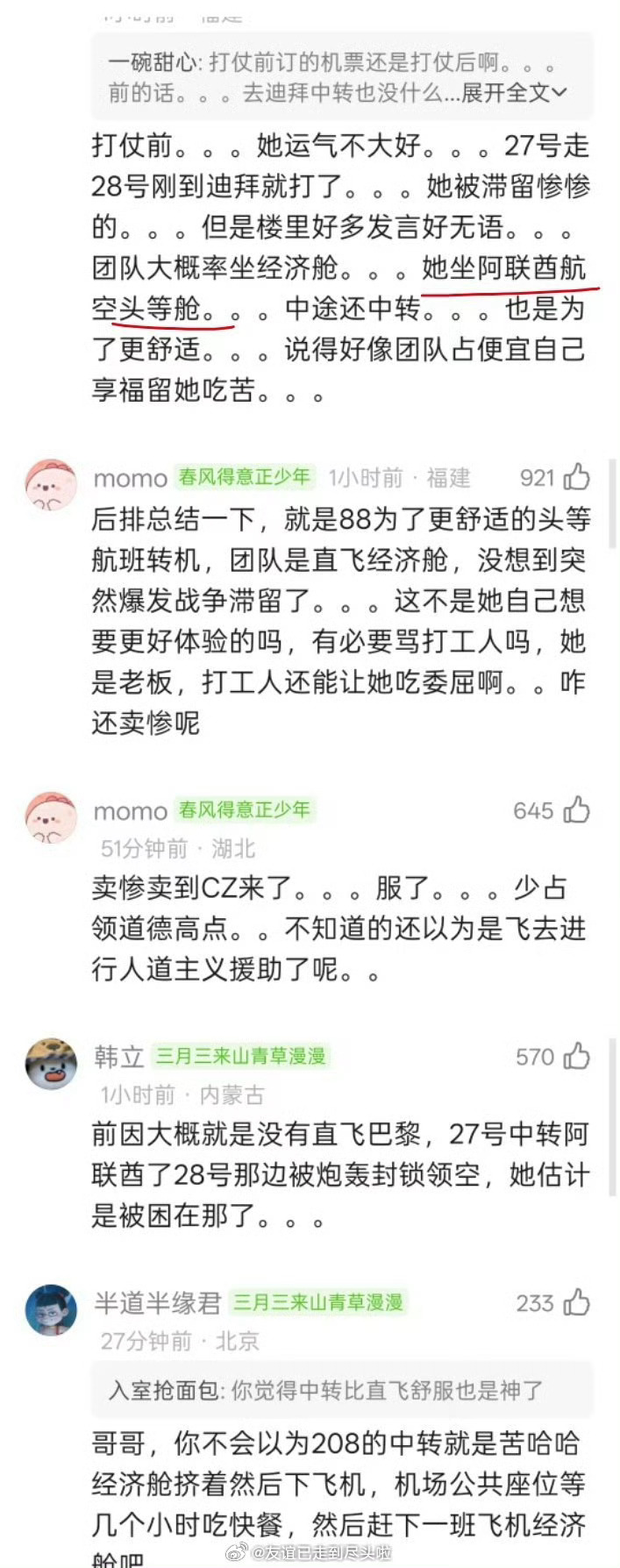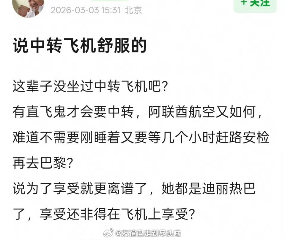 关于迪丽热巴出发去巴黎时装周转机滞留迪拜的事,现在网友讨论热点是为什么团队给买中转不买直飞?有说是为了阿联酋航空头等舱舒适,有说是因为中耳炎不能长时间坐长途,有说为了顺路去迪拜玩玩anyway,谁也没想到28号会遇上打仗,不用结果推论决策过程,不可能团队故意为了让自己艺人吃苦买的中转飞机吧迪丽热巴 滞留迪拜迪丽热巴将缺席时装周迪丽热巴 无法抵达巴黎