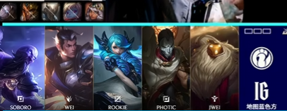 IG选用:Soboro格温,Wei赵信,Rookie瑞兹,Photic烬,Jwei巴德