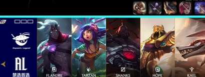 AL选用:Flandre塞恩,Tarzan纳亚菲利,Shanks沙皇,Hope韦鲁斯,Kael妮蔻