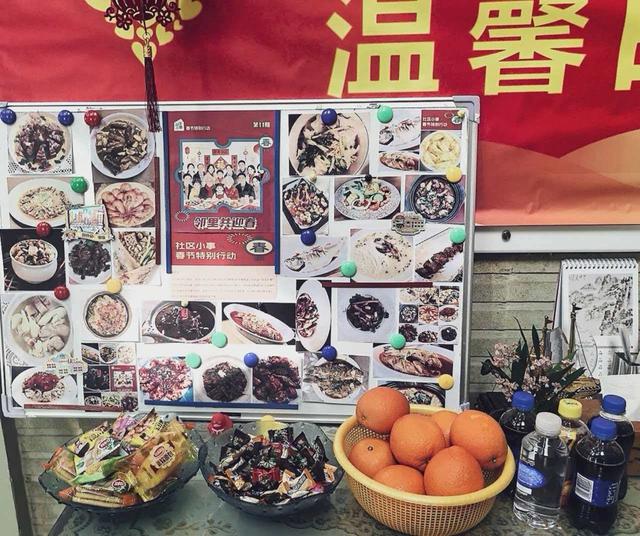 28道菜围绕着“社区小事春节特别行动”的主题,组成了“邻里共迎春年夜饭”专栏。从红烧肉到腌笃鲜,从腊味煲仔饭到糖醋排骨,密密麻麻贴满了版面。菜谱旁是新春祝福。楼道还备上糖果、水果、矿泉水,为忙碌的快递员、清洁工等城市建设者送去甜意。这桌“年夜饭”没有人真正坐下来吃,却是15号楼有史以来最热闹的一顿饭。