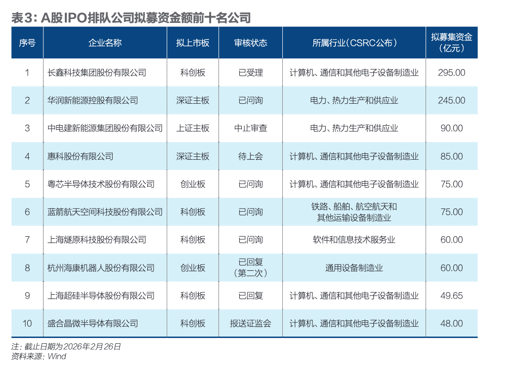 从排队上市的企业来看,截至2026年2月26日,341家A股IPO排队公司合计拟募资金额3447亿元。其中,拟登陆科创板、创业板、北交所的公司数量合计占比超八成;募资金额合计占比超七成。