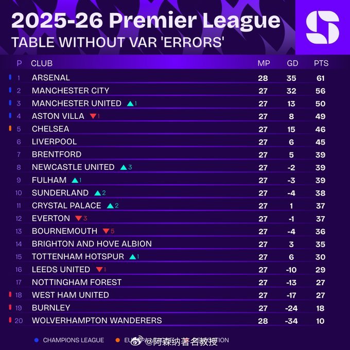 看完西甲我发现英超的判罚还算公正 以下是第28轮比赛后,如果没有VAR“误判”,英超联赛积分榜的最终排名:阿森纳61分居首,曼城56分、曼联50分,分列二三位 英超联赛 阿森纳著名教授