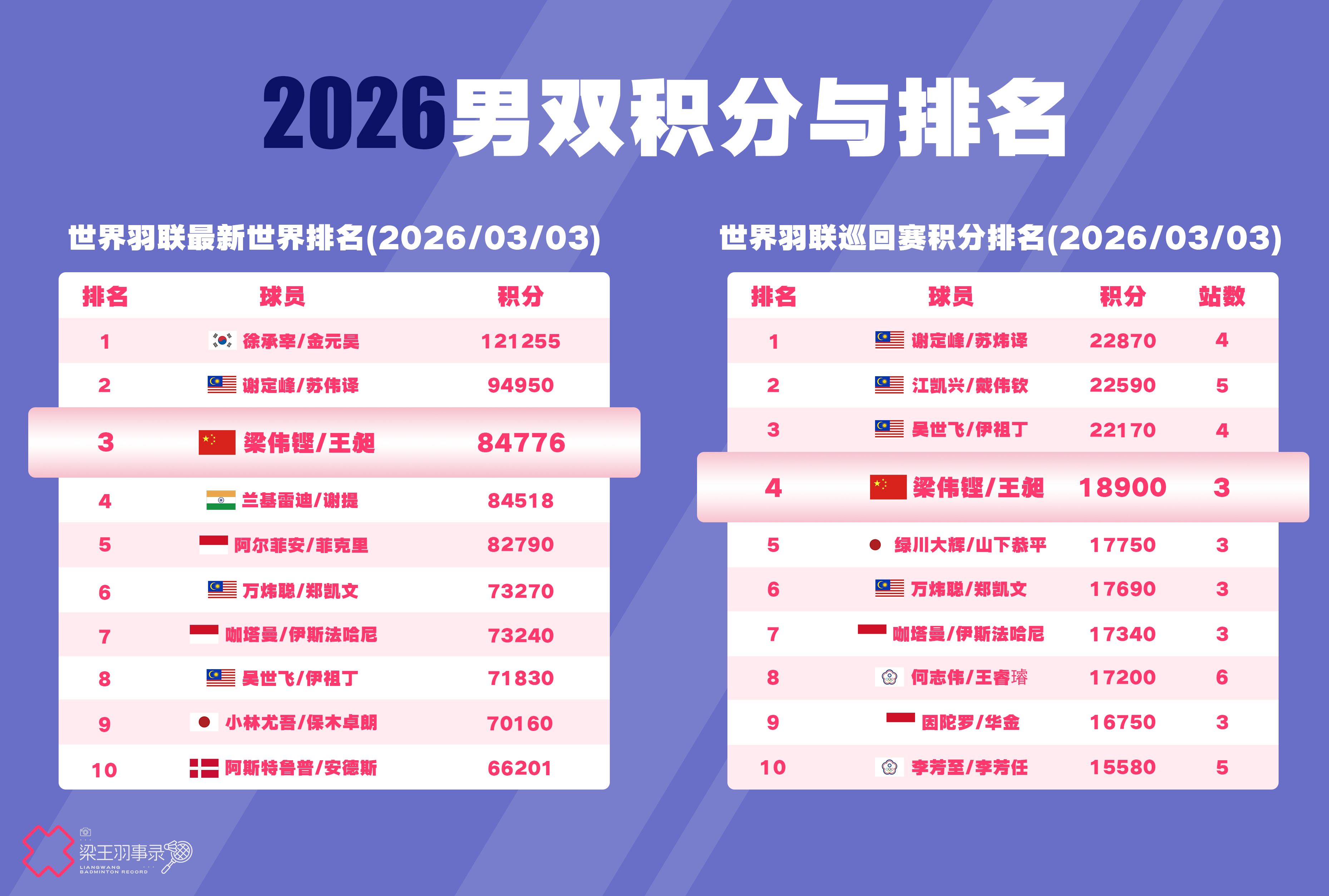 梁王驾到梁王组合 梁王加油 排名及积分更新(2026/03/03)BWF最新世界