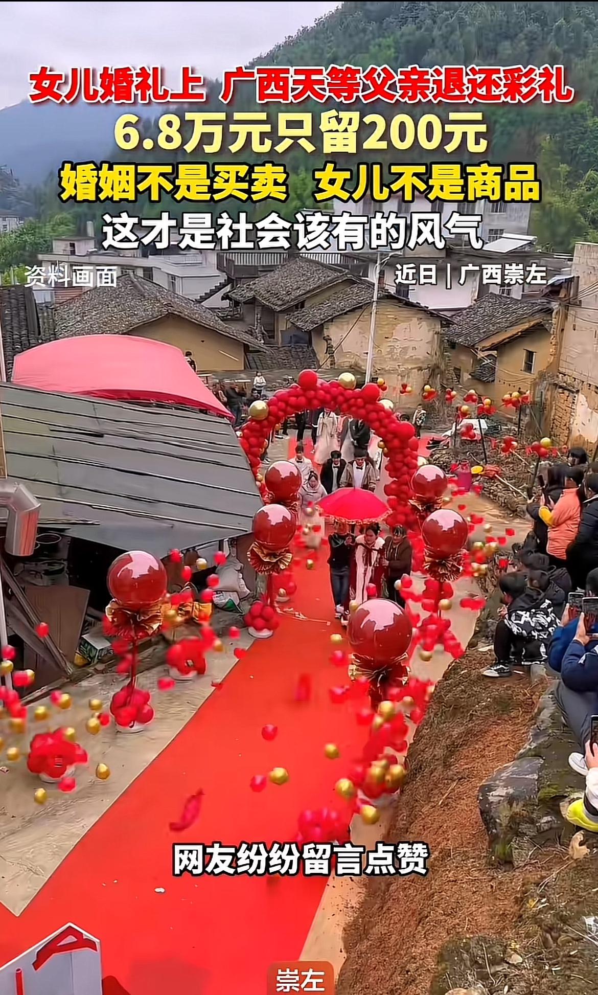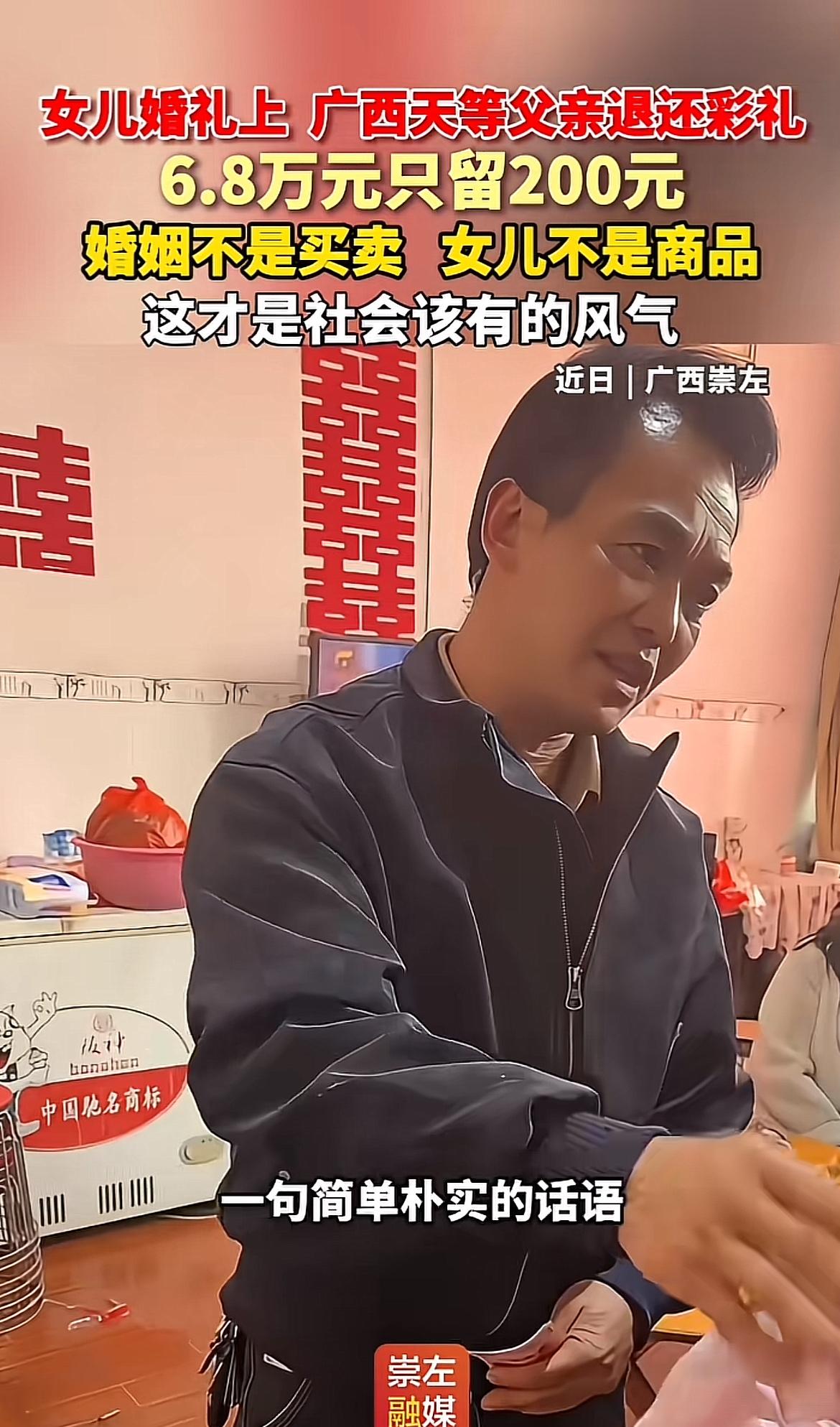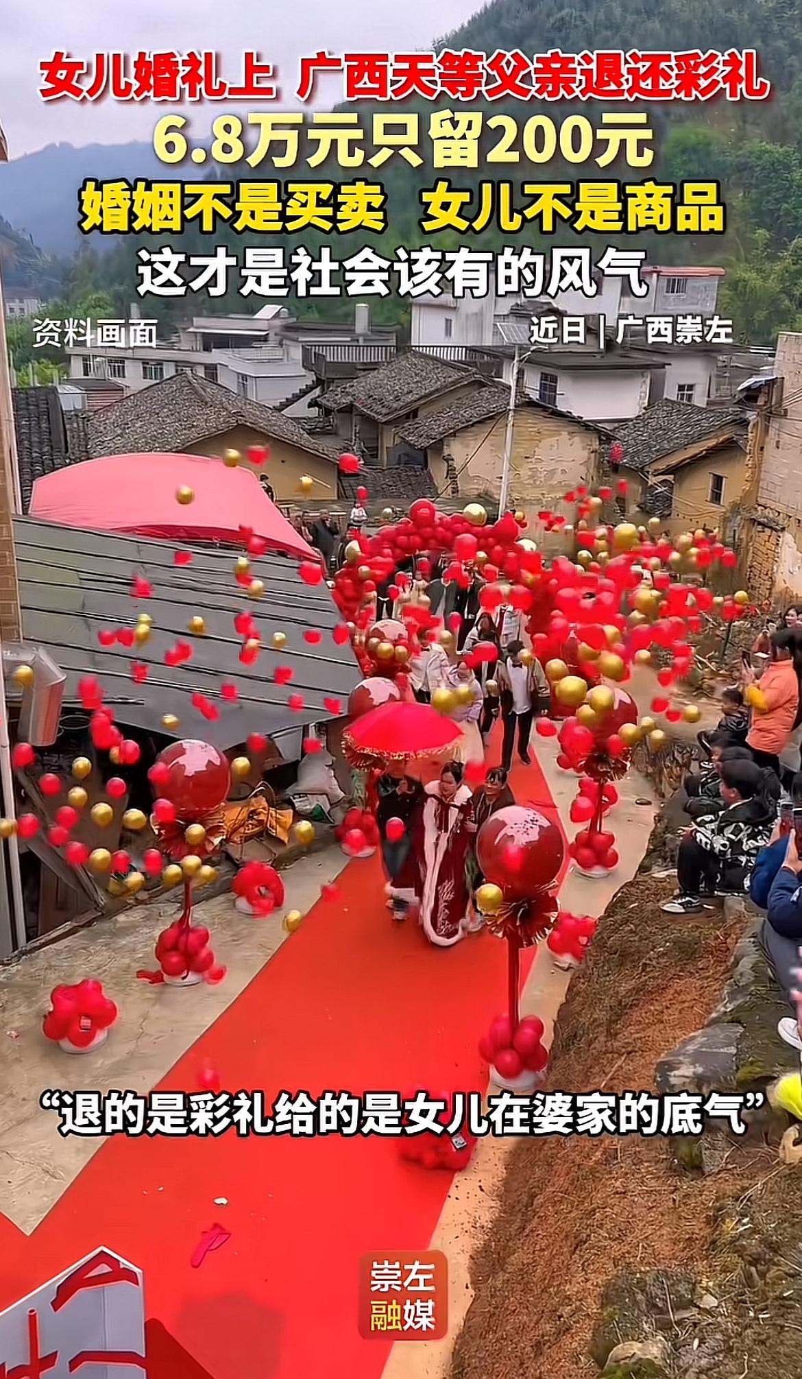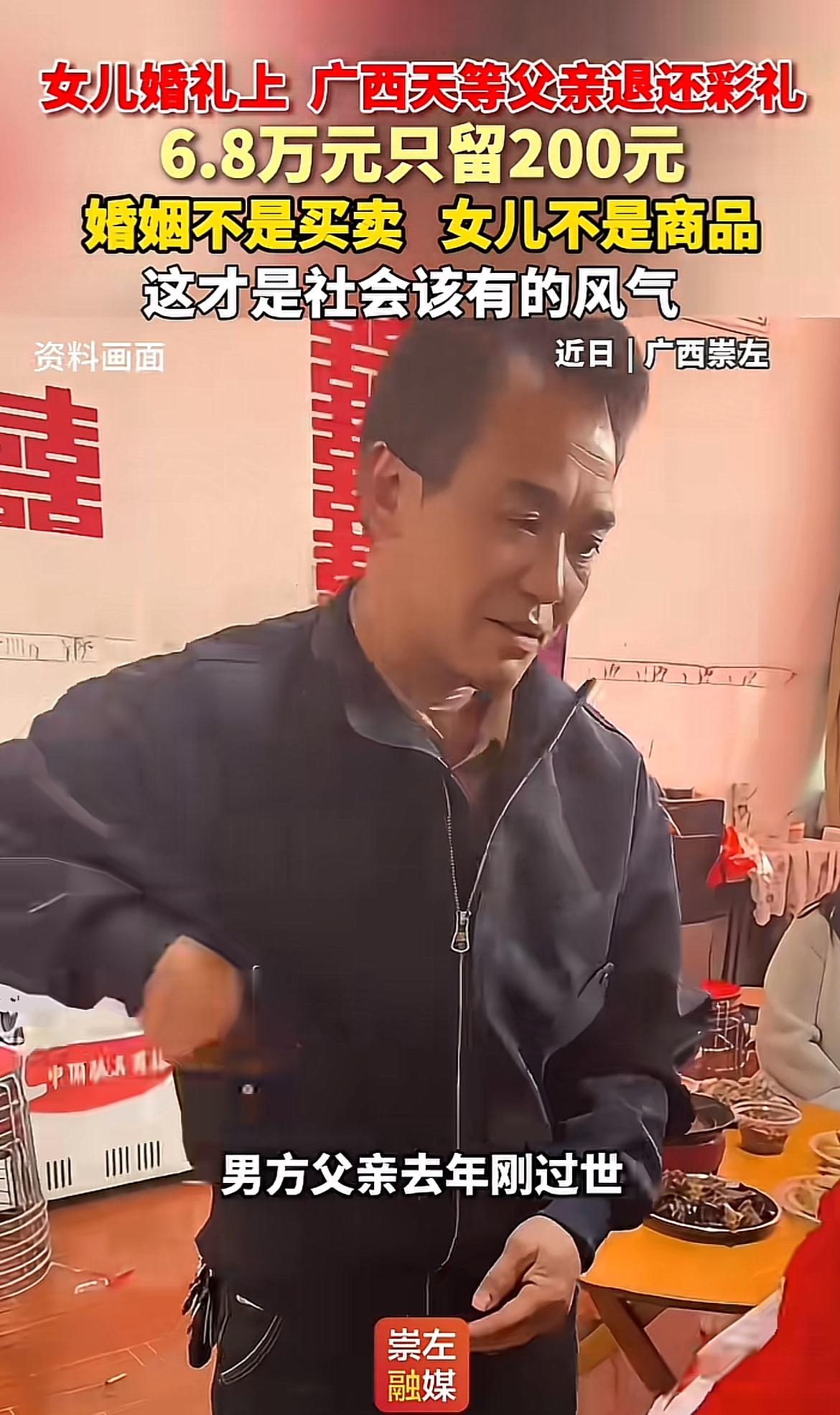 广西天等这场婚礼太感人了!新娘父亲农国芳面对6.88万元彩礼,仅取200元图吉利,余款退还,还拿出2万积蓄作陪嫁。他那句“我是嫁女儿,不是卖女儿”,质朴又动人。 原来女婿丧父后家境不好,彩礼都是借来的,农国芳不愿孩子刚成家就背债,这份体谅太珍贵。2万陪嫁是他多年打工攒下的,是对女儿未来的期盼。这一退一掏,让嫁妆回归祝福本质,也体现了乡村移风易俗。这样的父爱,温暖又实在,为这场婚礼增添了别样的温情。