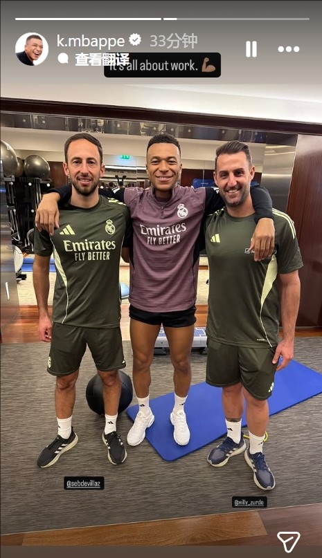 姆巴佩晒出了与皇马体能教练SébastienDevillaz和理疗师WillyZurdo的合照,配文写道:“一切全看努力。”