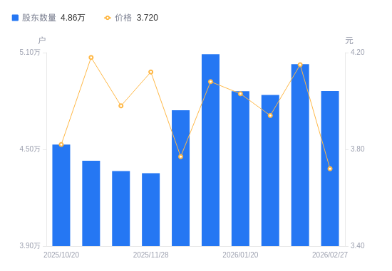 日期A股户数(户)流通A股户均持股数(股)户均持股市值(万元)2026-02-274861419666.377.322026-02-105028219013.987.892026-01-304837119765.177.792026-01-204860719669.207.932026-01-095090118782.757.662025-12-194742520159.437.602025-11-284352621965.289.052025-11-204365521900.388.722025-11-104429821582.489.022025-10-204529321108.368.06