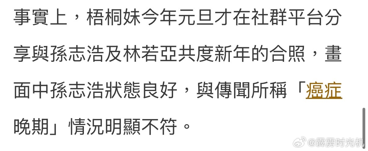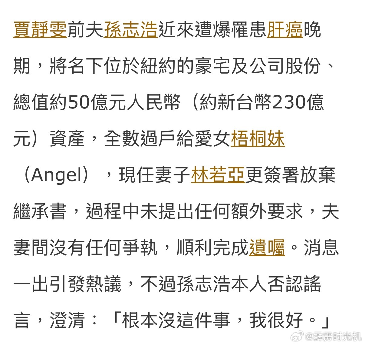 今天台媒说孙志浩患肝癌晚期,所有资产全归女儿梧桐妹,现任妻子林若亚放弃继承。孙志浩本人回应了