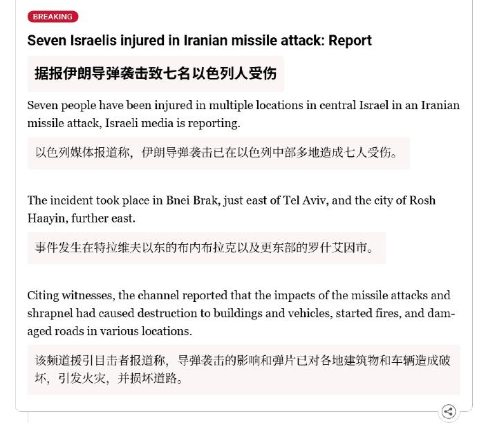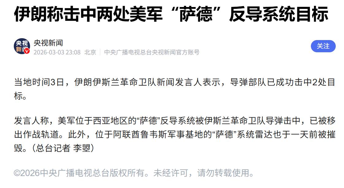 特朗普宣称:伊朗导弹发射器即将用尽。但是伊朗宣布:伊朗击中美国部署在西亚的第二套“萨德”导弹系统,美国也在考虑从韩国调派“萨德”和“爱国者”到中东地区。以色列媒体报告伊朗导弹袭击又在以色列中部多地造成七人受伤。所以现在到底谁说得对,一边说伊朗马上没有发射器了,一边又是报告受伤和损失情况。