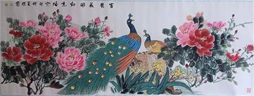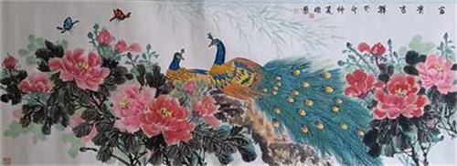 在《富贵花开》《吉祥富贵》等系列作品中,李凤兰更以巧思重构画面叙事。她创造性地将牡丹与山水相映,让花鸟画与山水画的边界在笔墨中自然消融:山间云雾缭绕处,几簇牡丹悄然绽放,既有山水的雄浑作为底色,又有牡丹的明艳点亮画面;有时她还会引入孔雀、凤凰等灵禽,让翎羽的华美与牡丹的雍容相映成趣,共同构成“万物和谐”的意境。这般构图,不仅拓展了传统花鸟画的视觉维度,更赋予了牡丹新的象征意义。