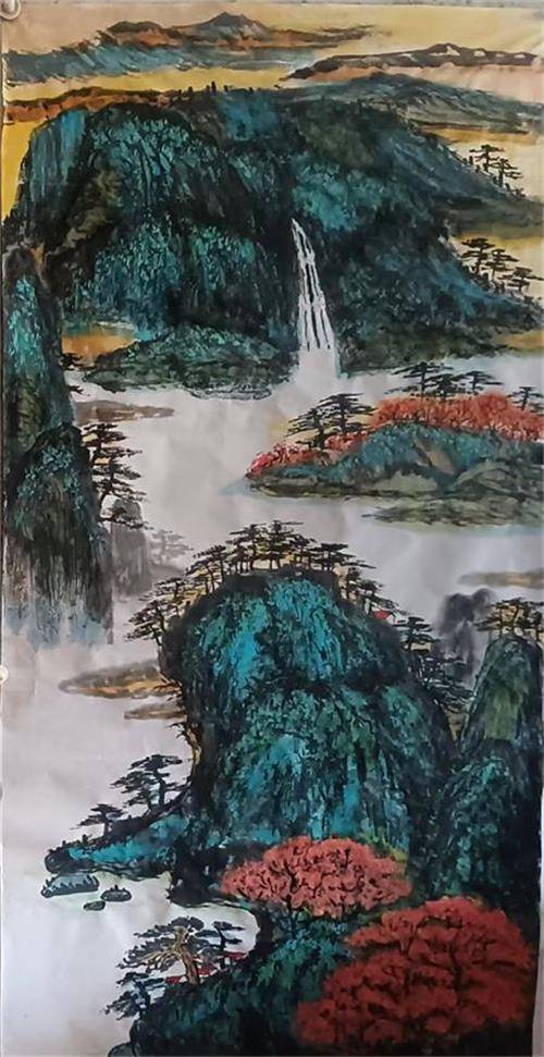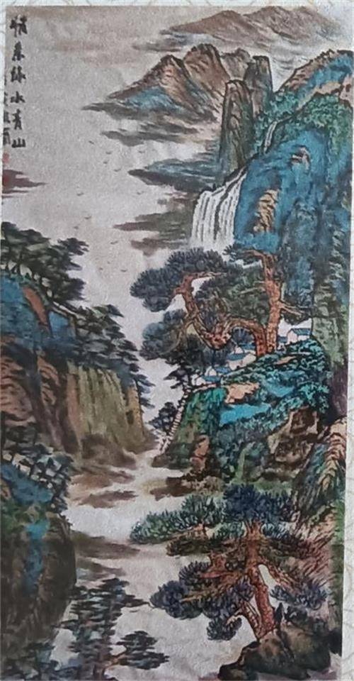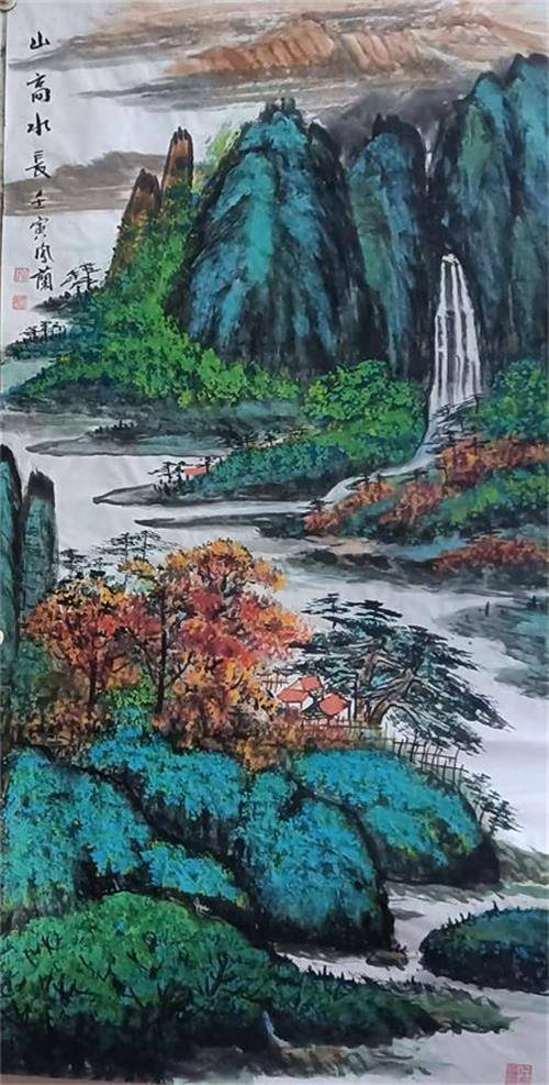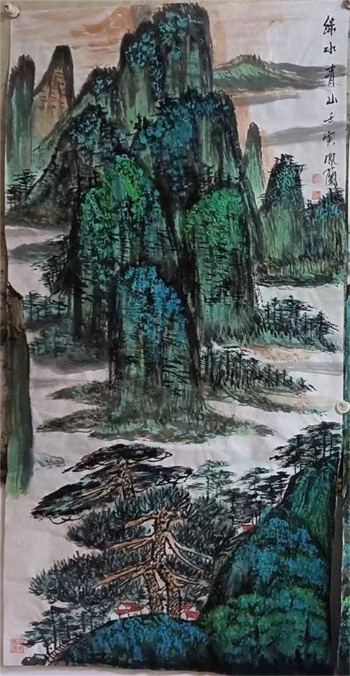 若说牡丹是李凤兰艺术世界的“艳色”,那山水便是她笔墨里的“骨相”。她的山水画创作,处处可见对传统的深刻理解与突破性创新。早年师从多位山水画大家的经历,让她得以博采众长:北派山水的雄浑壮阔、南派山水的秀润灵动,在她笔下实现了奇妙的融合,最终凝练为独具个性的青绿山水语言。在《江山多娇》等系列作品中,她以传统笔墨为基,中锋用笔勾勒山石轮廓,侧锋皴擦表现肌理,再以石青、石绿等矿物颜料层层晕染,让山川既显厚重苍劲,又不失清新明快。更令人称道的是,她将现代构成理念巧妙融入布局——画面中色块的对比、线条的节奏、空间的分割,既遵循传统“经营位置”的章法,又带着现代艺术的简约与张力,让山水既有古意,又具当下审美气息。