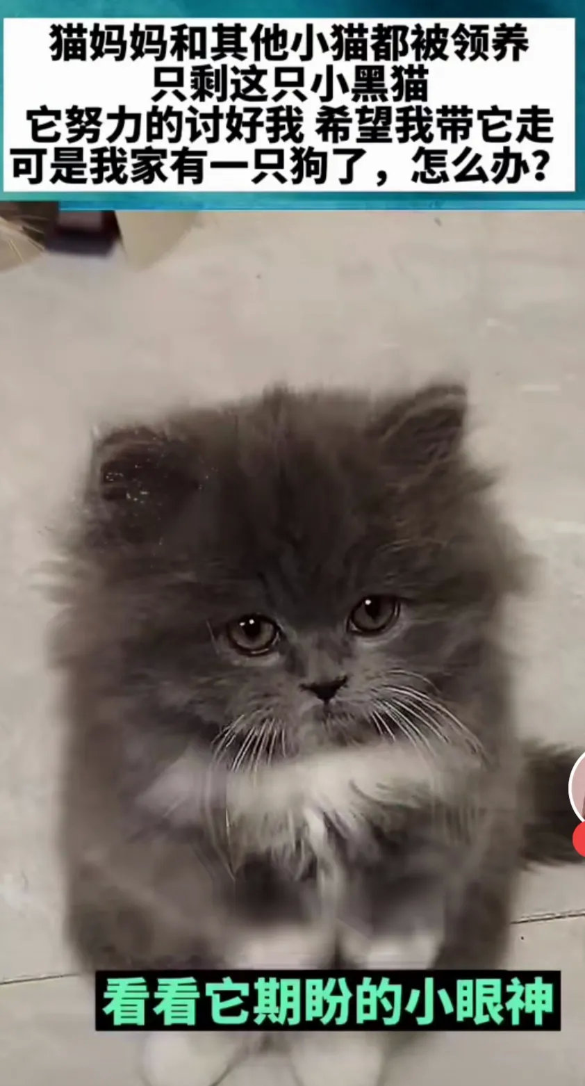 这只小黑猫多可爱啊,眼神中充满祈求,这位好心人还在犹豫,因为家里已经有一只小狗了。