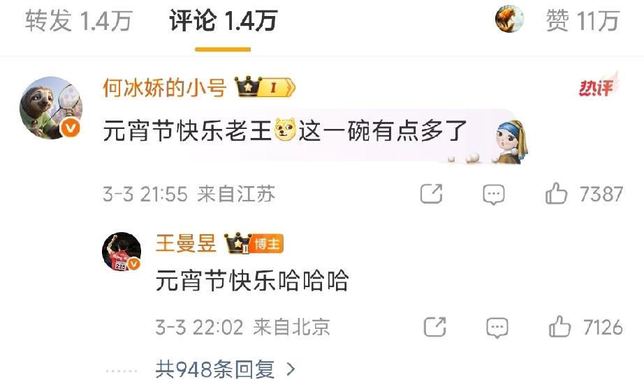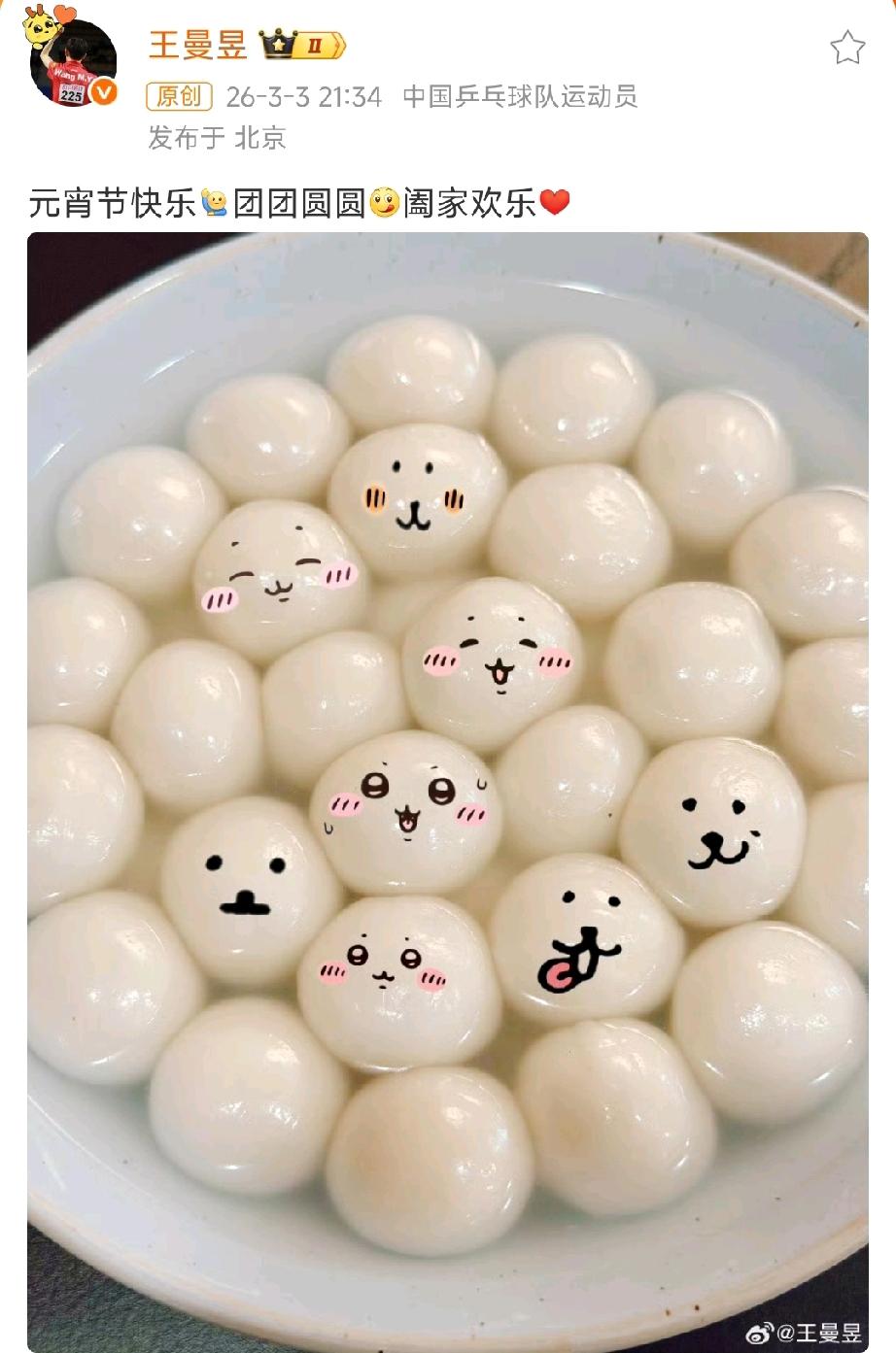 元宵节当晚,一直在网上非常低调的王曼昱终于忍不住冒泡,出来送球迷祝福啦! 王曼昱拍摄的自己吃的小汤圆,还给P上可爱笑脸,童心满满! 好友羽毛球名将何冰娇也是第一时间追着评论老王,这次因为评论的挺快,老王终于看到了,回复好友“元宵节快乐哈哈哈”! 其实,两个人私下很熟的好友,有事没事,何冰娇一个微信就可以联系到老王了!