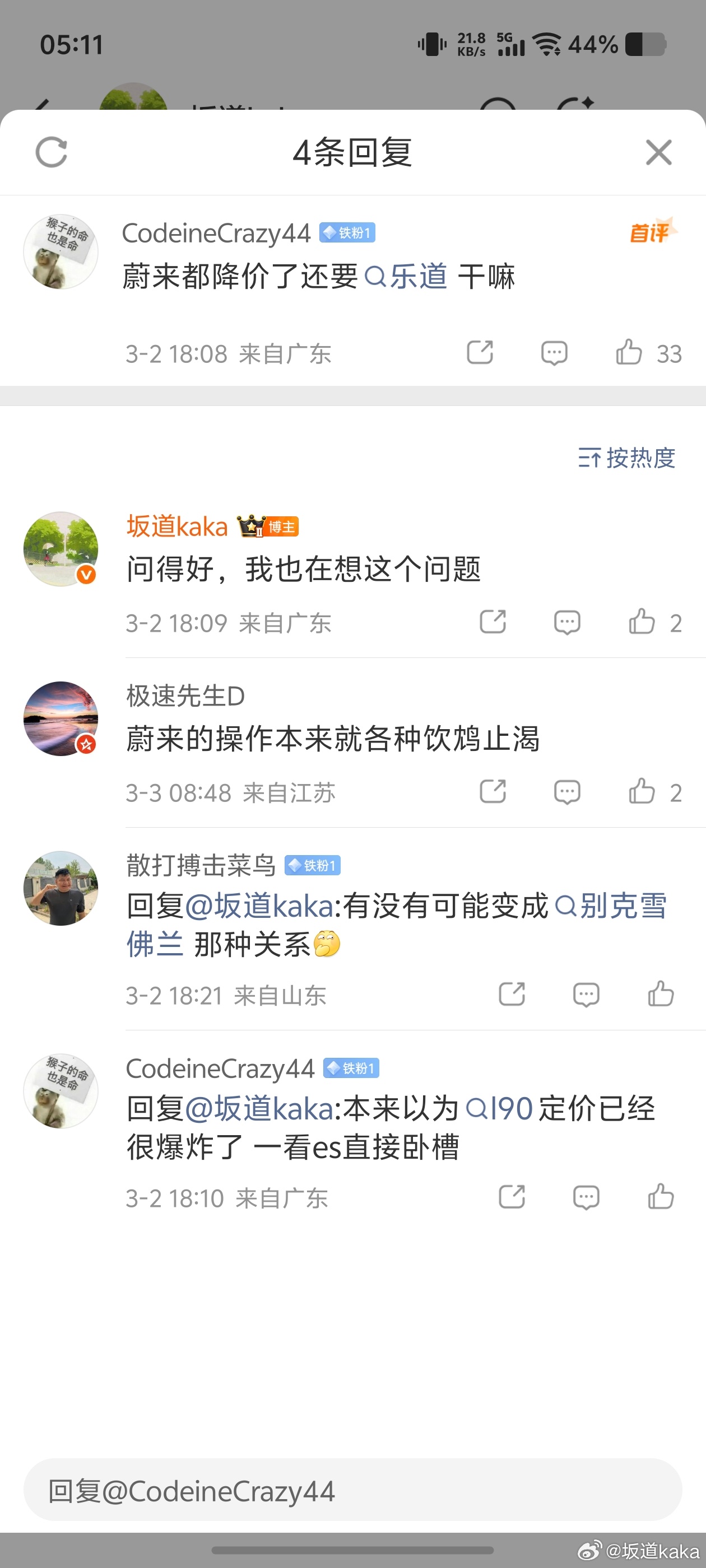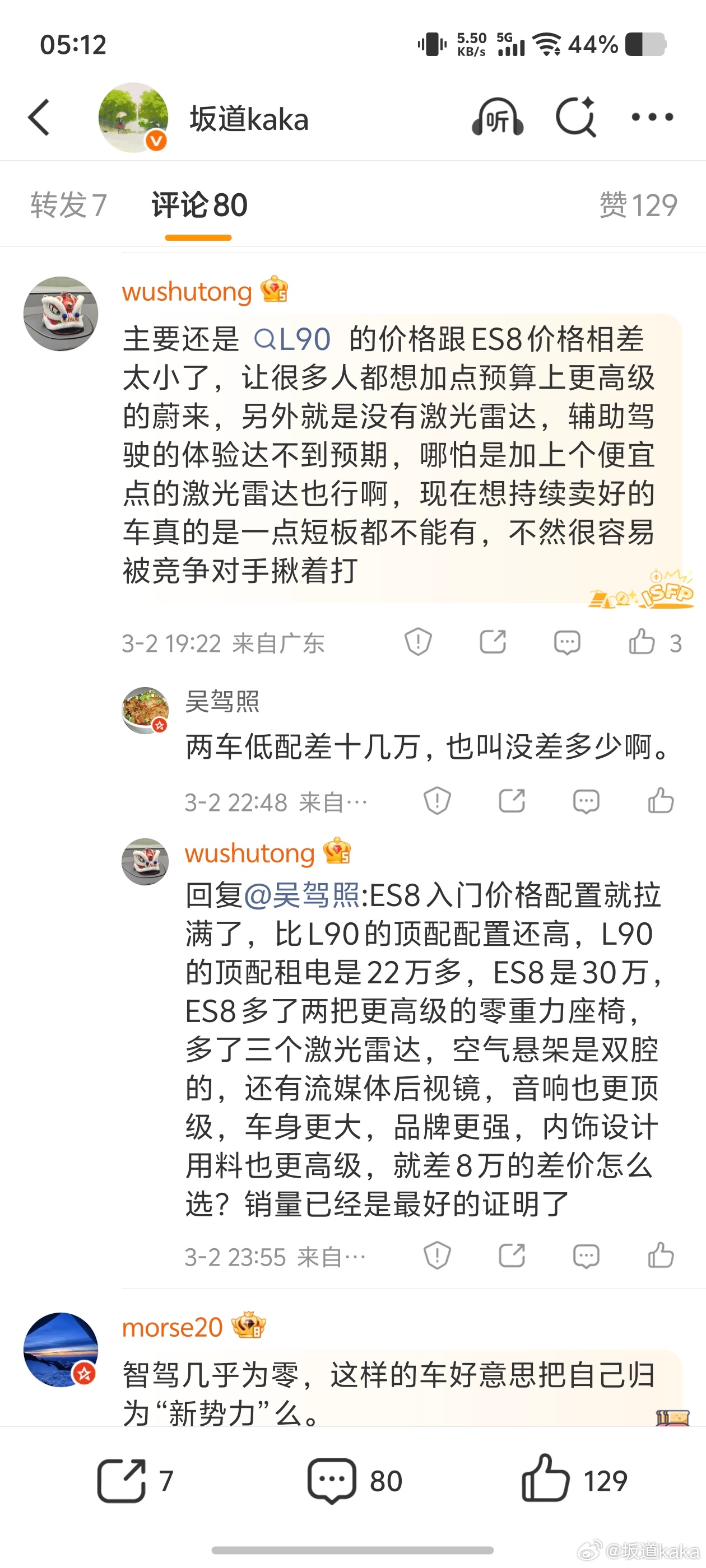 所以在我前几天的微博评论区,就有老哥分享了他的思路——他觉得多花几万块就可以买到更高配置,更大尺寸,更舒服的蔚来ES8,所以他果断放弃了乐道L90买了蔚来,我读到这条评论就感觉整个故事非常抽象。