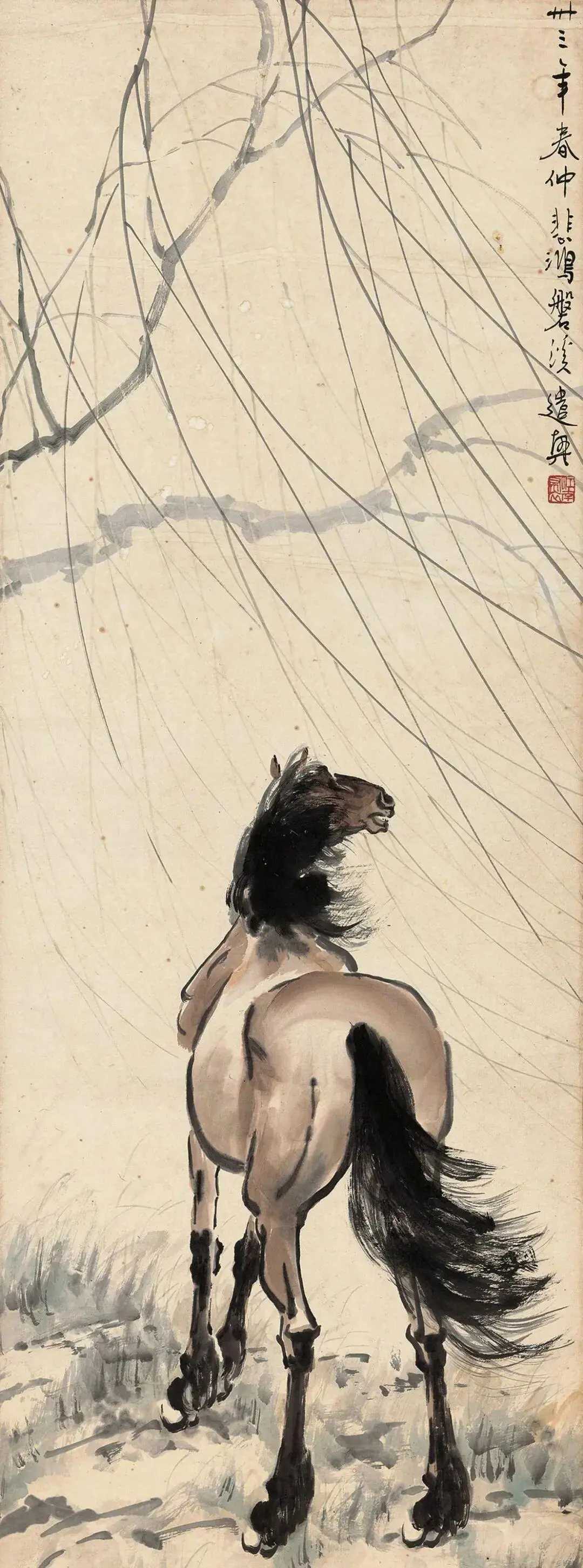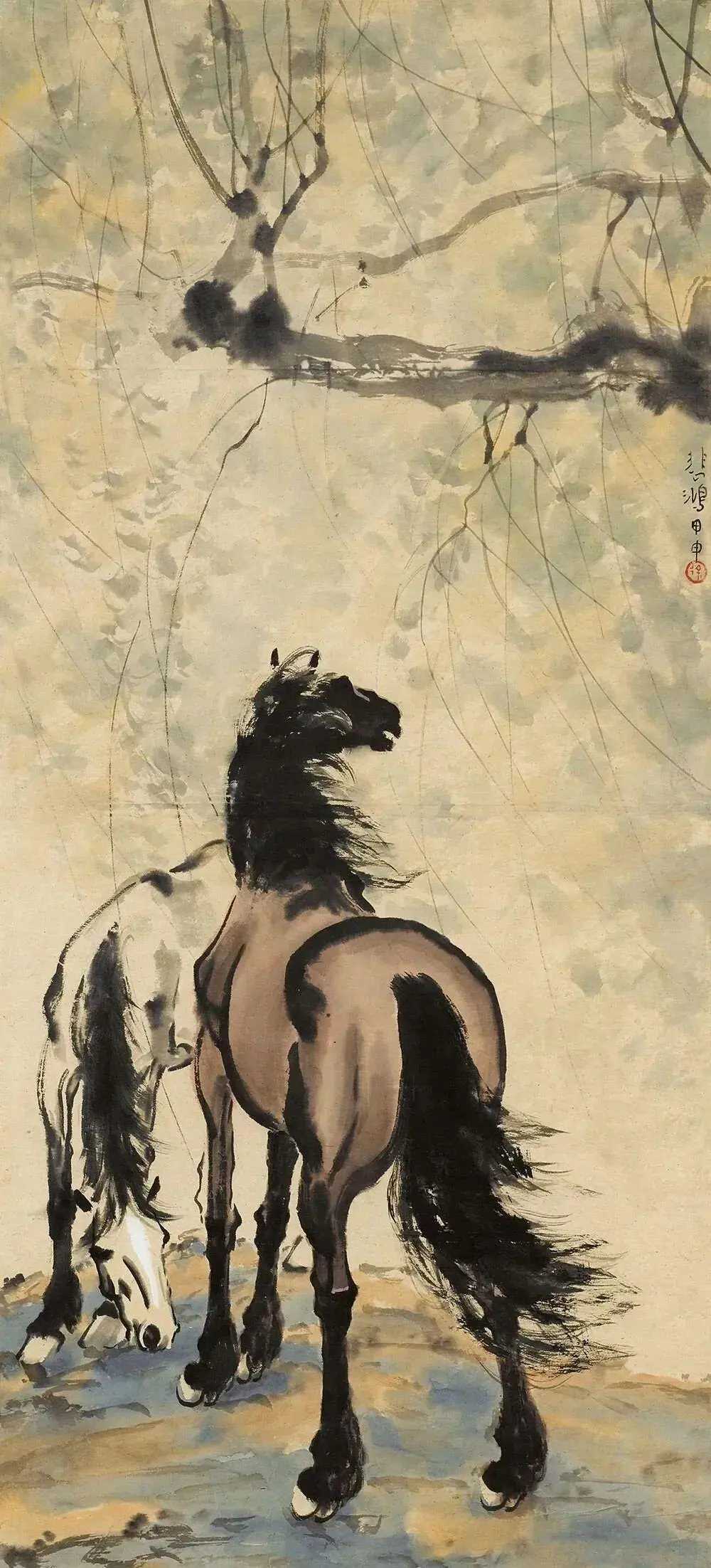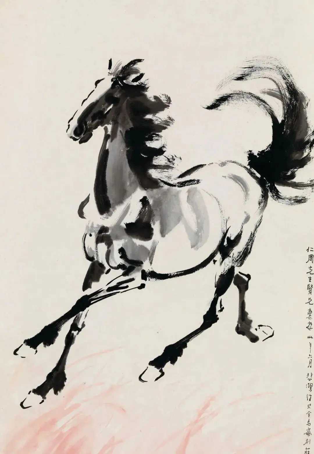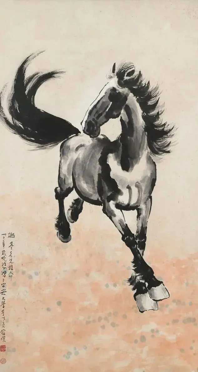 徐悲鸿最擅画马,他笔下的奔马给人以生机和力量,表现了令人振奋的积极精神。为现代中