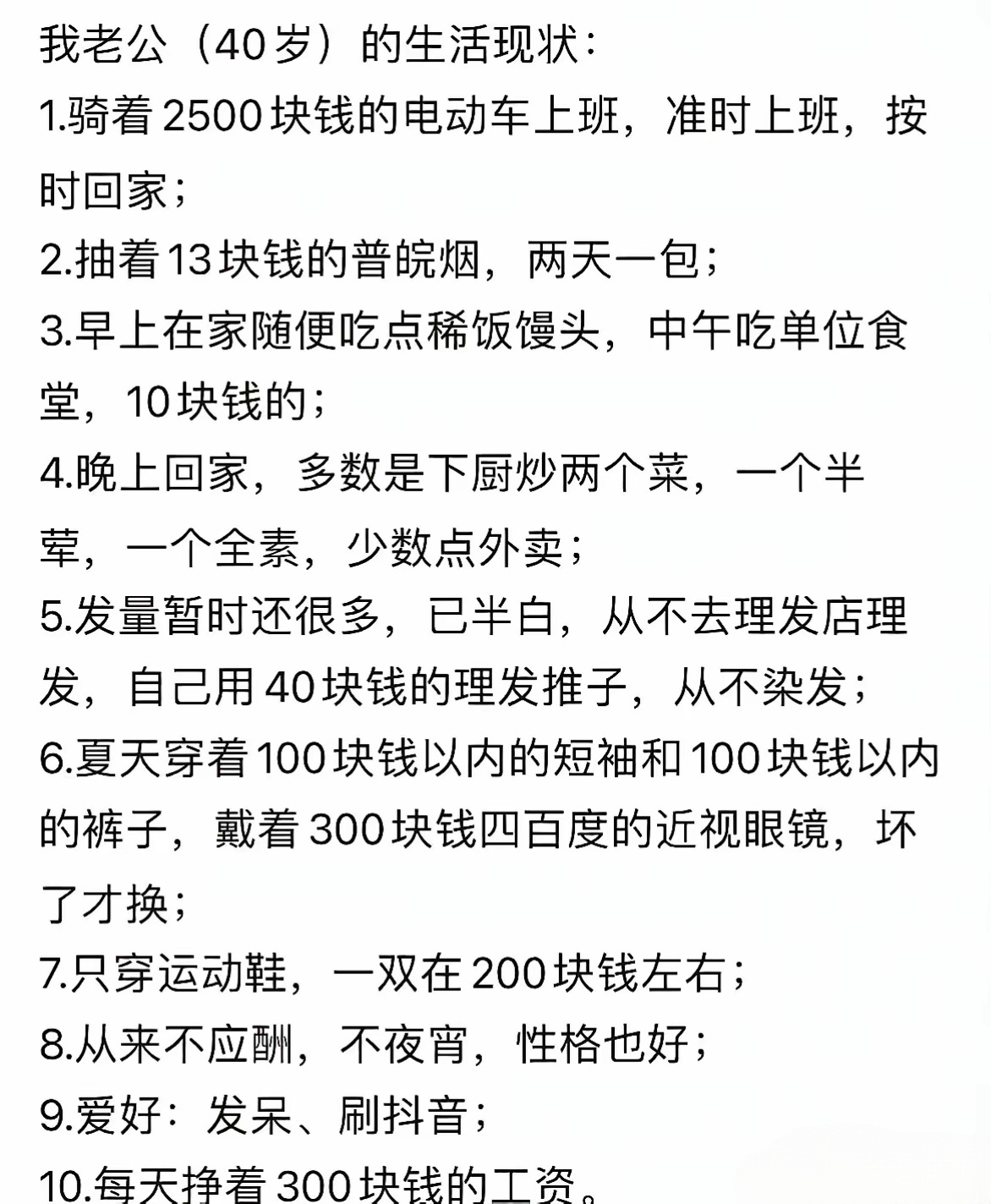 一女子分享老公40岁的生活现状,“感觉老公很没情调”。
