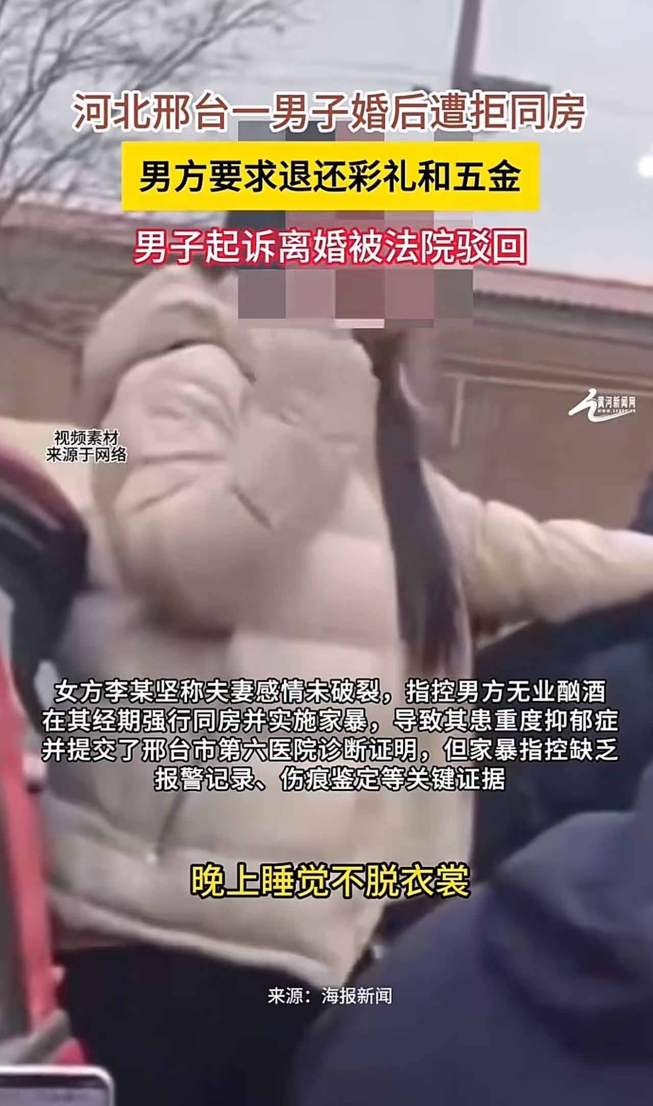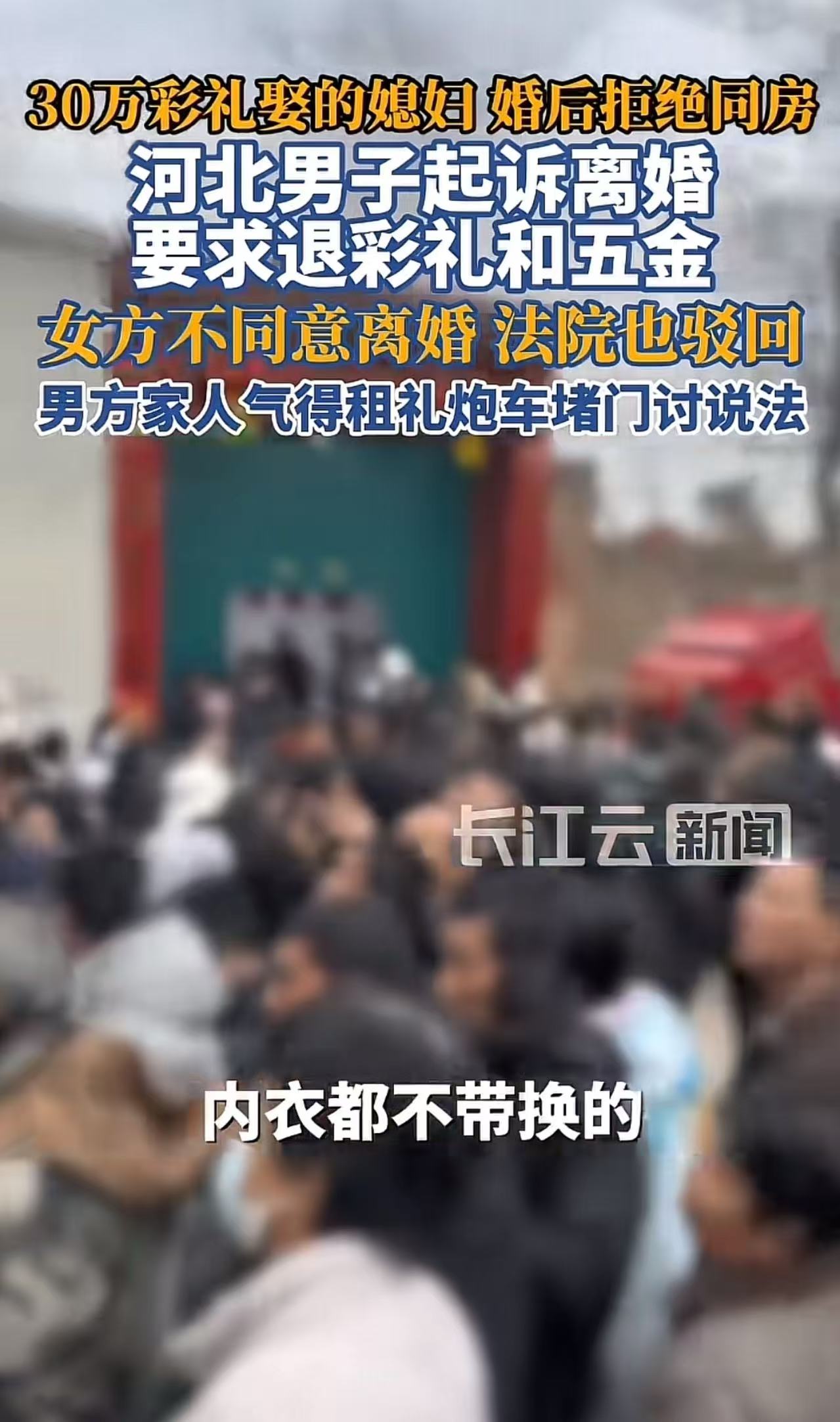 河北邢台30多万彩礼娶的媳妇儿,婚后一直拒绝同房,男方起诉离婚并要求退还彩礼和五金首饰,却因女方不同意离婚,且男方证据不足,法院不予支持,于是男方家人租礼炮车在女方家门口讨说法,全网炸锅!
