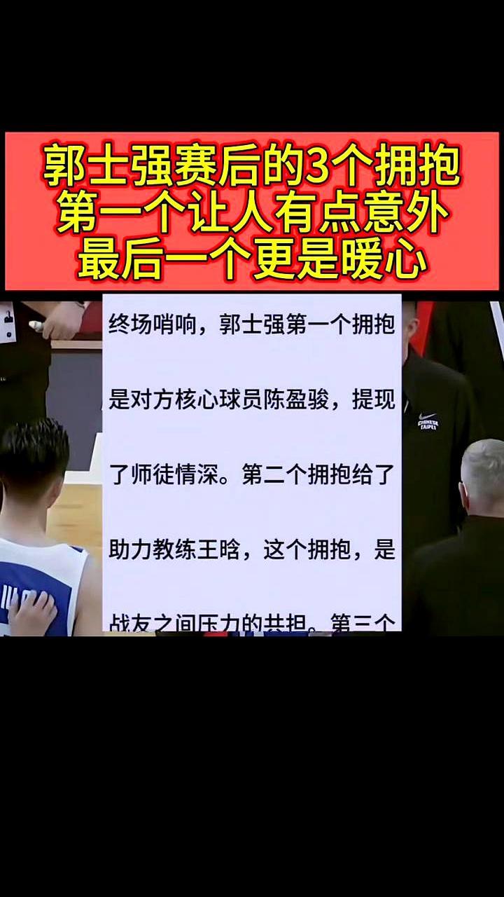 竞技体育的底色是成王败寇,但惊险逆转后,最高级的宣泄却是沉默。 马尼拉终场哨响,中国男篮100比93险胜。主帅郭士强没有狂欢,而是走向三个男人。 先抱对手阵中砍下26分的陈盈骏。昔日师徒在赛场死磕,赛后只剩轻声祝福。 再抱助理教练王晗。从落后到翻盘,只有战友懂这种被架在火上烤的煎熬。 最后抱拼下20分12篮板的胡金秋。内线肉搏耗尽体能,他得到主帅最直接的托底。 这剥离了狂热,露出成年人最稀缺的体面。重压下维系团队不崩盘的,往往是人与人最原始的共担。 人在绝境中,到底更需要一句震耳欲聋的口号,还是一个懂你的拥抱?