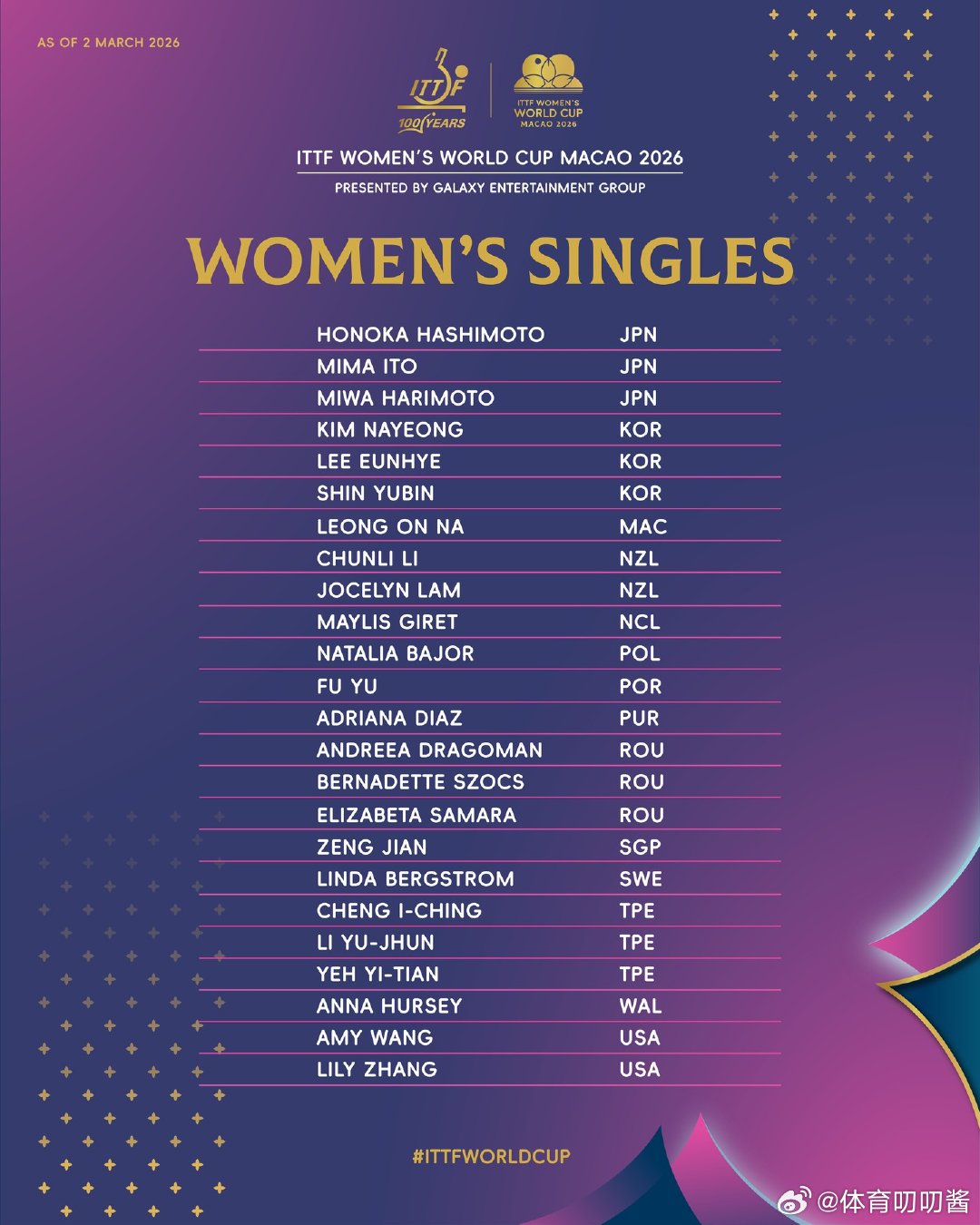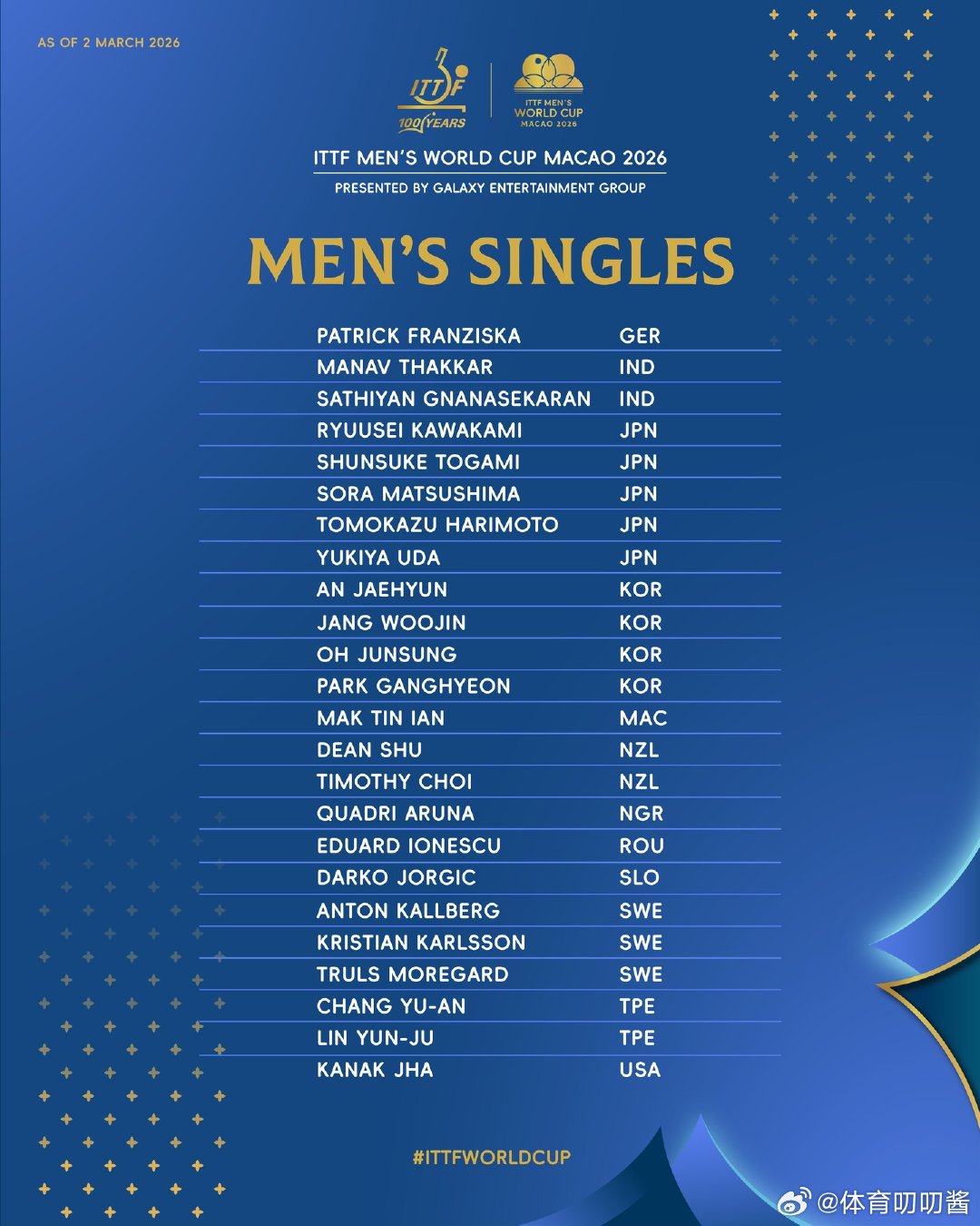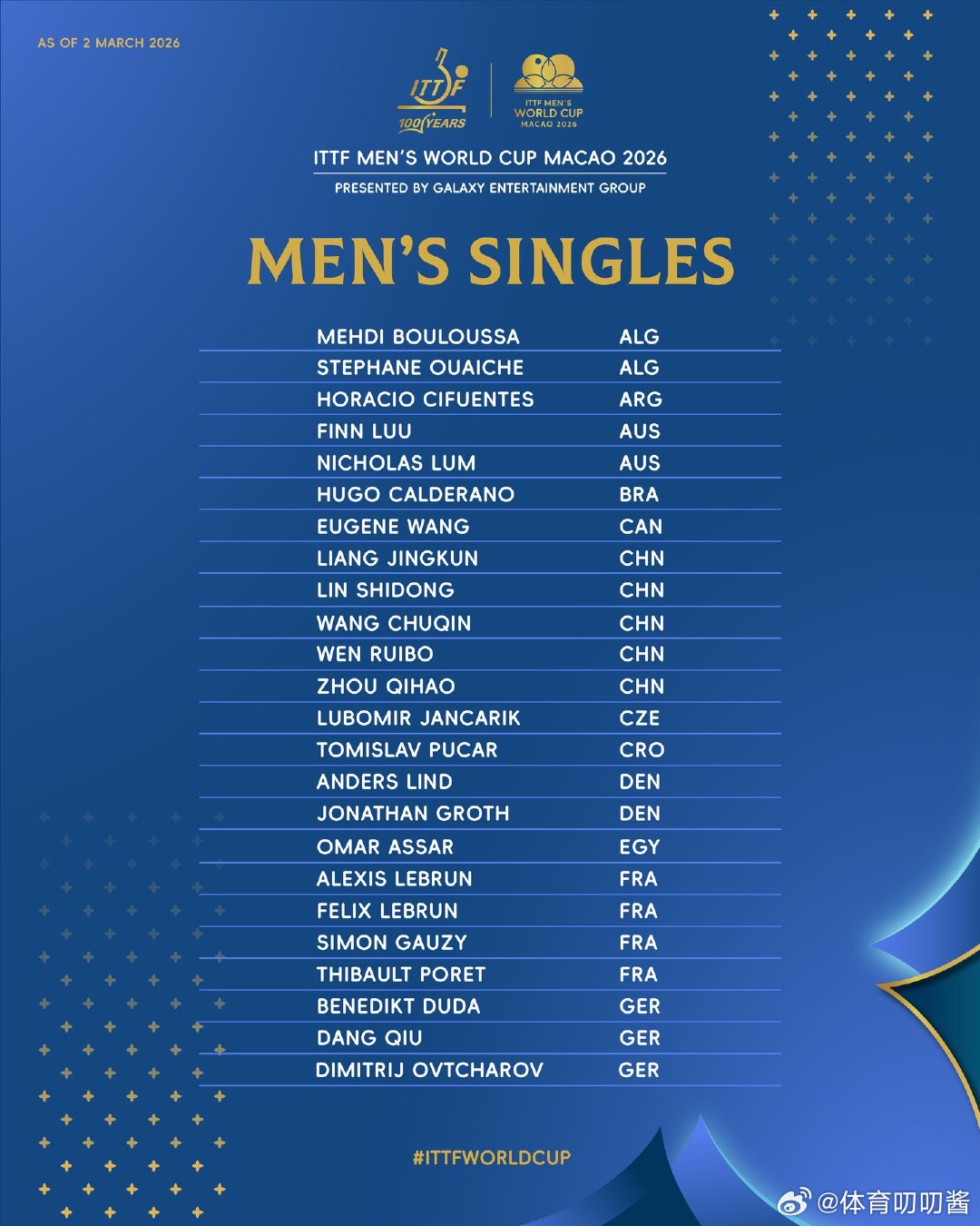 更新参赛全名单2026澳门乒乓球世界杯