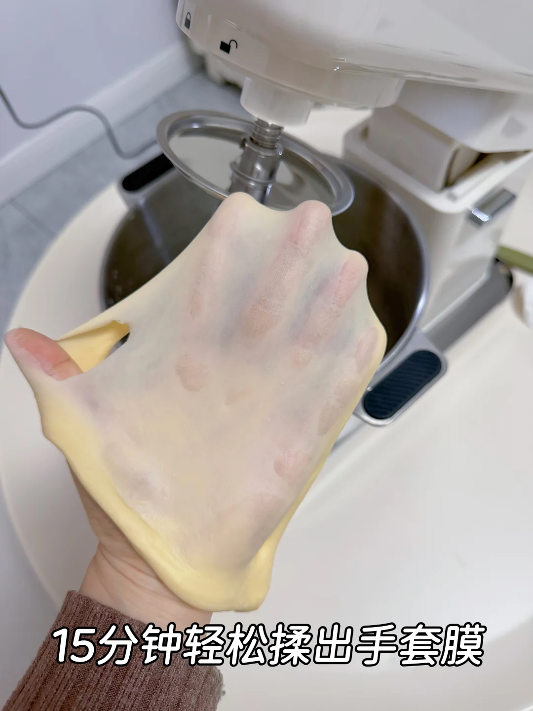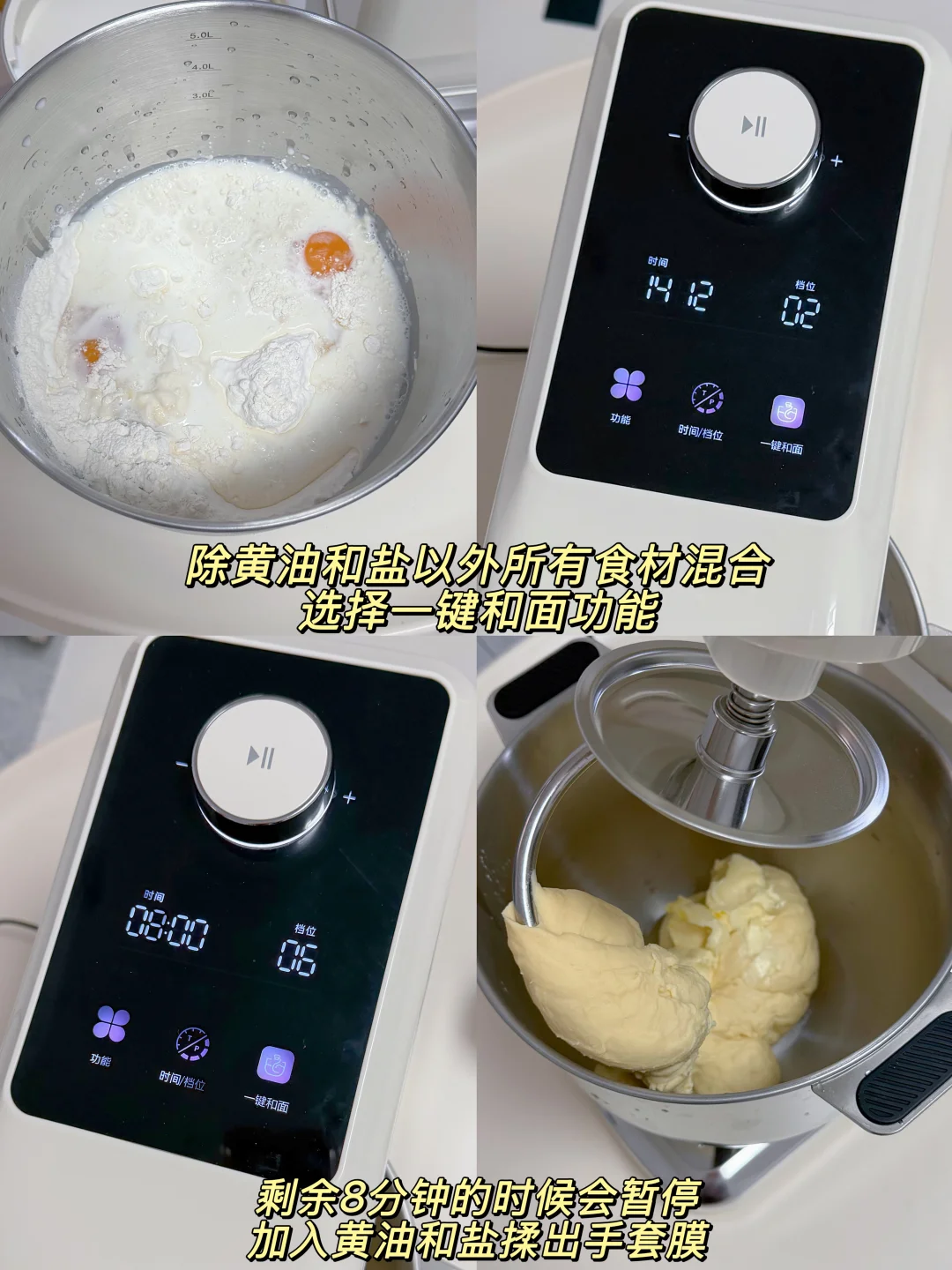 [一R]除黄油和盐以外所有食材混合,厨师机直接选择一键和面功能,剩余8分钟暂停,加入软化黄油和盐,继续揉出手套膜