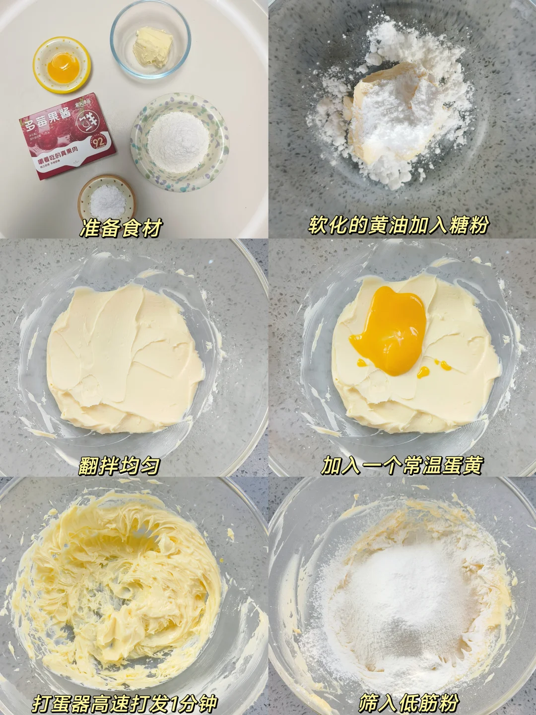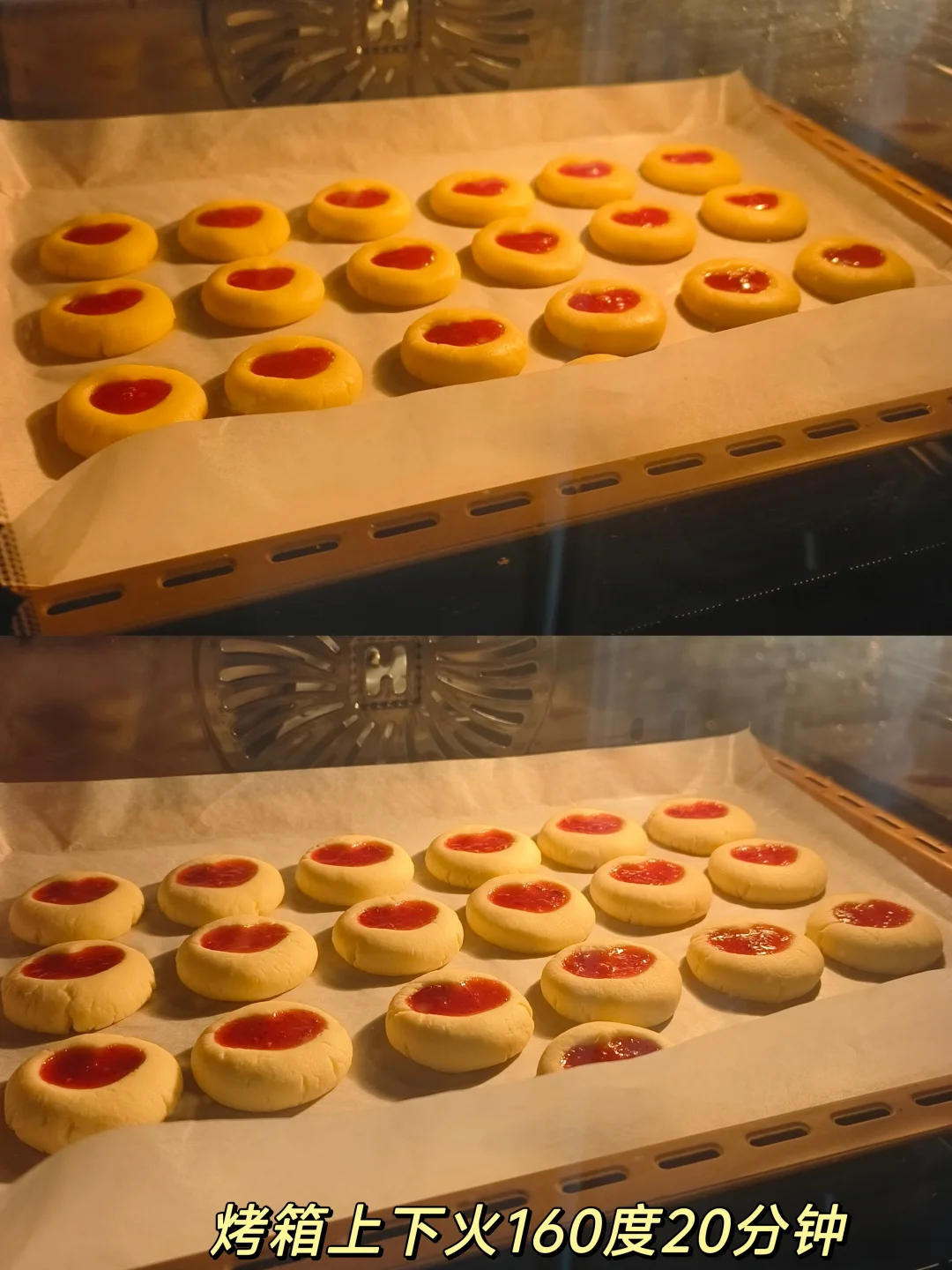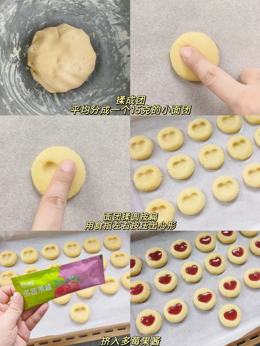 每一块饼干都是独一无二的~ 刻上爱的印记,入口很酥,超级好吃,奶香味十足,新手小白都能驾驭哦! 💓黄油100克,糖粉25克,常温蛋黄一个,低筋粉160克,多莓果酱30克 1.室温软化黄油加糖粉压拌均匀 2.加入常温蛋黄,打蛋器高速打发1分钟 3.筛入低筋粉揉成团,平均分成每个15克的小面团 4.面团揉圆按扁,用食指左右按压出心形,挤入食尖津品的多莓果酱,这款果酱配料表干净,酸酸甜甜很好吃,独立包装很方便。 5.烤箱上下火160度20分钟。