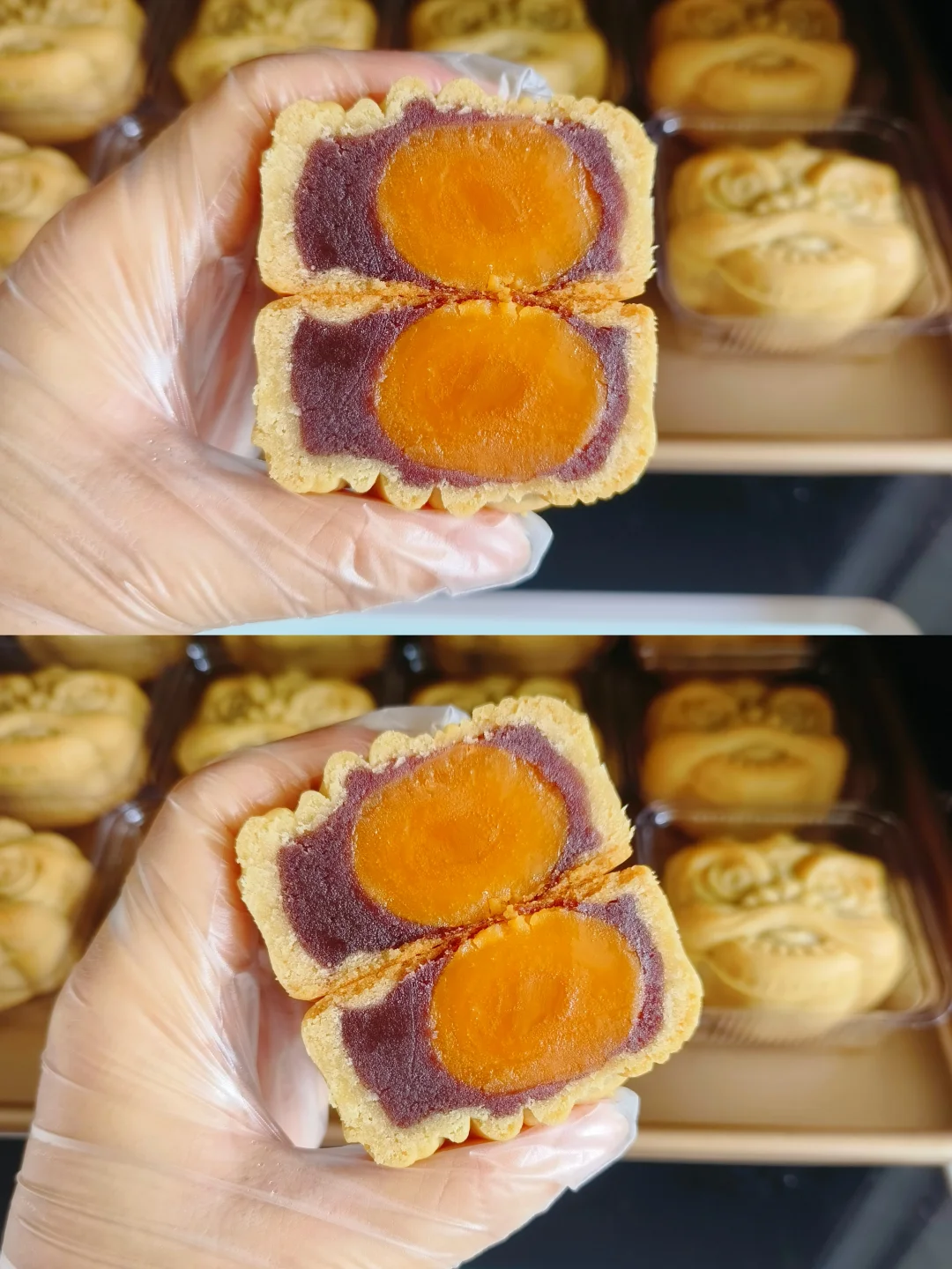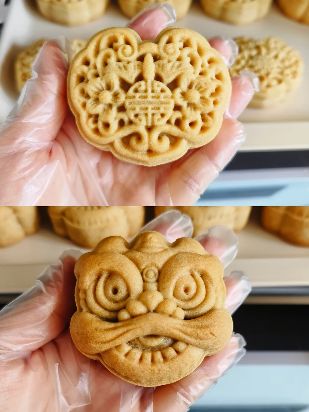 5.月饼出炉后晾凉,一定要带手套拿取月饼,防止变质,然后放入脱氧剂,密封,2-3天回油就可以吃啦!