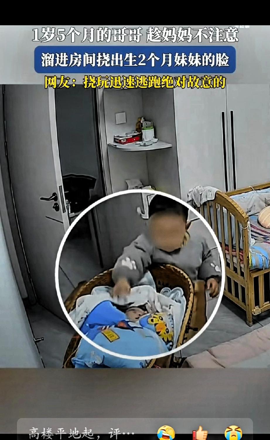 一岁五个月的男孩,趁家长不在身边,独自走进卧室,来到两个月大正在熟睡的妹妹旁边,伸手抓了妹妹的脸部,之后很快离开。整个过程突然又让人担心。 孩子妈妈表示,宝宝年纪小,认知还不成熟,只是出于好奇,并没有恶意。客观来说,这么小的孩子确实不存在故意伤害的想法,但幼儿下手没有分寸,新生儿皮肤娇嫩,脸部和眼睛又十分脆弱,一旦被抓伤,很可能造成难以挽回的伤害。 很多二胎家庭都会遇到类似情况。大宝突然变得敏感、黏人、甚至出现一些过激行为,大多不是调皮,而是内心缺乏安全感。自从二宝出生后,家人的注意力大多集中在更小的孩子身上,陪伴大宝的时间变少,互动也减少,孩子无法用语言表达不安,只能用行为来吸引关注。 不少家长习惯说“你是哥哥/姐姐,要让着弟弟妹妹”,却忘了大宝也只是个需要疼爱的孩子。长期被忽视,会让孩子产生失落感,甚至对二宝产生抵触情绪,这对两个孩子的成长都不利。 照顾二胎确实辛苦,但平衡好大宝和二宝的感受,才是家庭和谐的关键。平时多给大宝一些拥抱和鼓励,让他明白,爸爸妈妈的爱不会因为二宝的到来而减少。引导大宝一起参与照顾弟弟妹妹,反而能培养彼此的感情。 孩子的行为,都是内心情绪的反映。多一点耐心,多一点关注,就能避免很多不必要的风险,也能让两个孩子在有爱、公平的环境里健康成长。