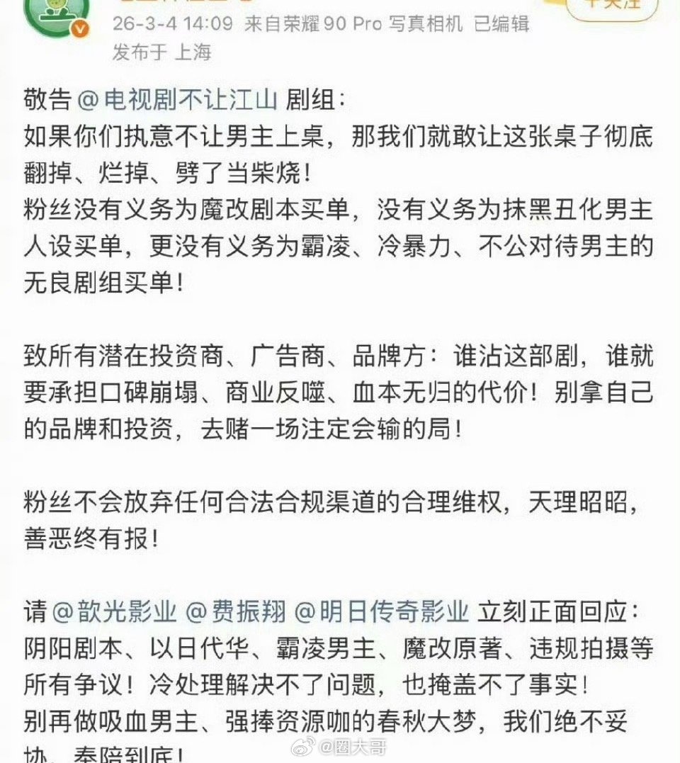杨洋粉丝发文敬告不让江山剧组杨洋粉丝这是操碎了心啊,又一次发长文敬告电视剧《不让江山》剧组,看得出来粉丝这是担心杨洋会再次受委屈啊,不过话说回来,杨洋能复工开拍,也是想了挺多的吧,希望有个好结尾啊~杨洋粉丝敬告不让江山