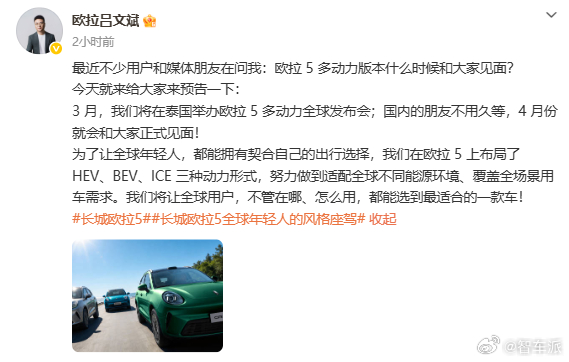 欧拉 5 官宣!3 月泰国全球首发,4 月国内上市燃油、混动、纯电三动力齐发🚗