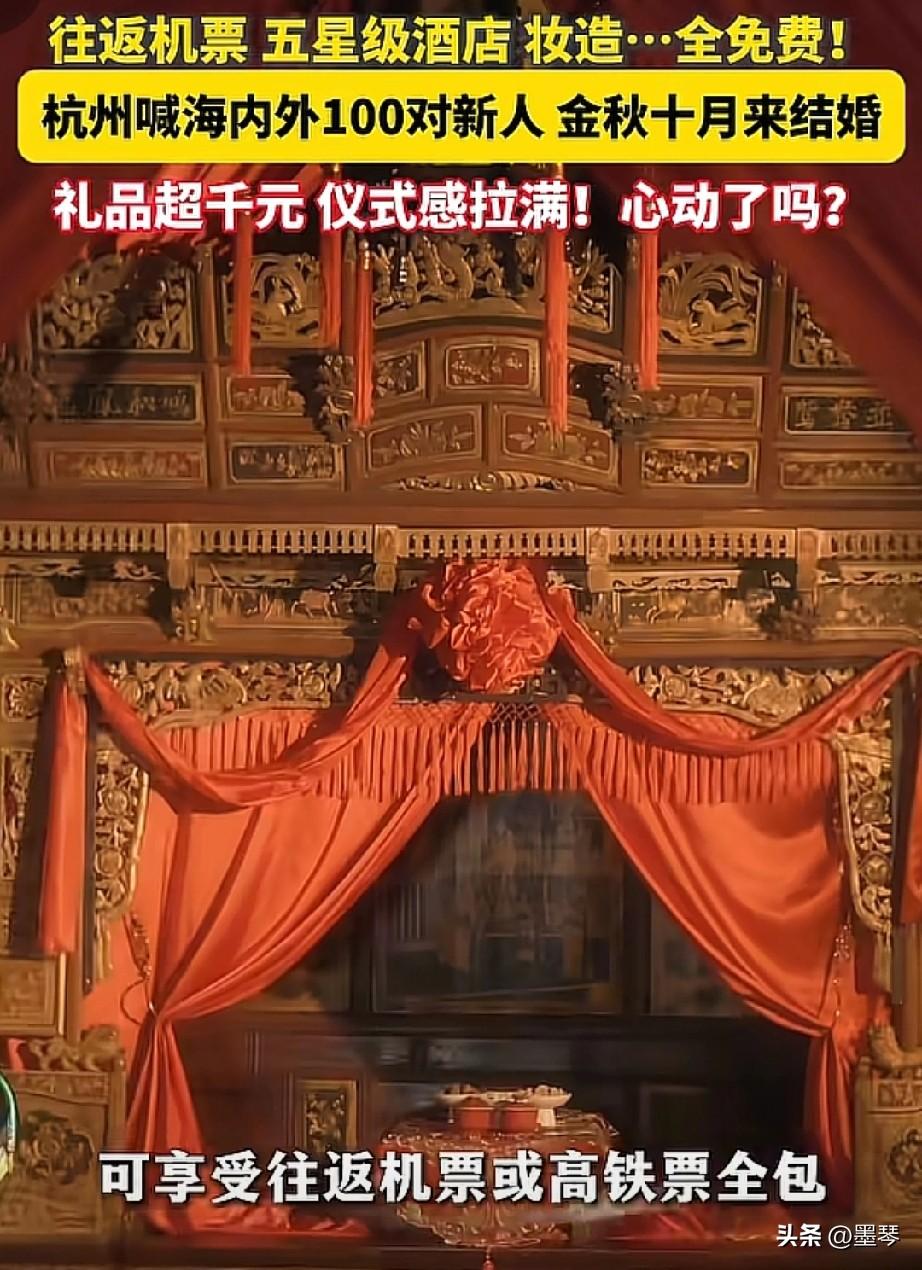 重磅!杭州向全球发喜帖:100对新人名额,机票酒店全免! 家人们!重大好消息!爱情之都杭州又搞大事情了!就在昨天,第28届(2026)中国国际西湖情五粮液玫瑰婚典元宵湖上发布会在西湖音乐喷泉水上平台盛大启幕,官方正式向海内外发出盛情邀请——金秋十月,诚邀100对新人来杭州免费办一场顶配婚礼! 🎉 0元办婚礼!杭州宠粉无上限 这场公益婚典直接把“宠粉”刻进DNA,往返机票/高铁票、五星级酒店吃住、高档婚服、专属妆造,全程免费!免费!免费! 除此之外,还附赠超千元精美礼品、珍藏家训书籍、百年好合证书,婚典全程视频跟拍、集体合影、活动保险统统安排到位💖。 新人还能专属体验花车巡游、彩船畅游西湖,在湖光山色里解锁独属于杭州的浪漫仪式感,这样的神仙福利,谁能不心动? 宋韵+国际,解锁婚礼新高度 本届婚典以“中意爱情之都 共筑和美生活”为主题,融合杭州宋韵文化与意大利维罗纳爱情文化,打破地域界限,见证多元浪漫🌍。 无论是刚领证的新婚夫妇,还是想补拍仪式感的夫妻,只要心怀对爱情的美好期许,都能报名参与。 想象一下,在西湖的粼粼波光中许下终身誓言,在千年运河的悠悠文脉中缔结良缘,这样一场兼具文化底蕴与浪漫氛围的婚礼,远比独自筹备更有意义✨。 报名通道已开启,手慢无! 目前报名通道已正式开启,采用社会公开报名+组织报名相结合的方式,面向全球招募100对新人,报满即止! 不管是国内情侣还是海外友人,只要符合报名要求,都有机会解锁这份免费浪漫🎁。 别再纠结婚礼预算、不用操心筹备琐事,来杭州,让这座浪漫之城为你们的爱情保驾护航,留下终身难忘的幸福印记! 金秋十月,西湖为证,良缘待续! 还在犹豫什么?赶紧转发给身边的准新人,抓住这场免费的浪漫盛宴,来杭州开启你们的幸福新篇章吧!