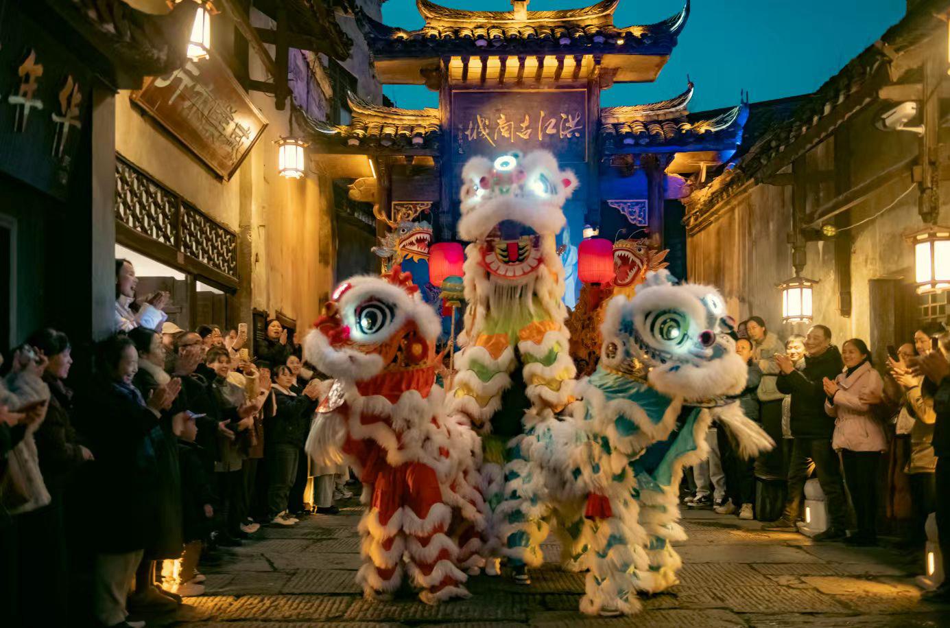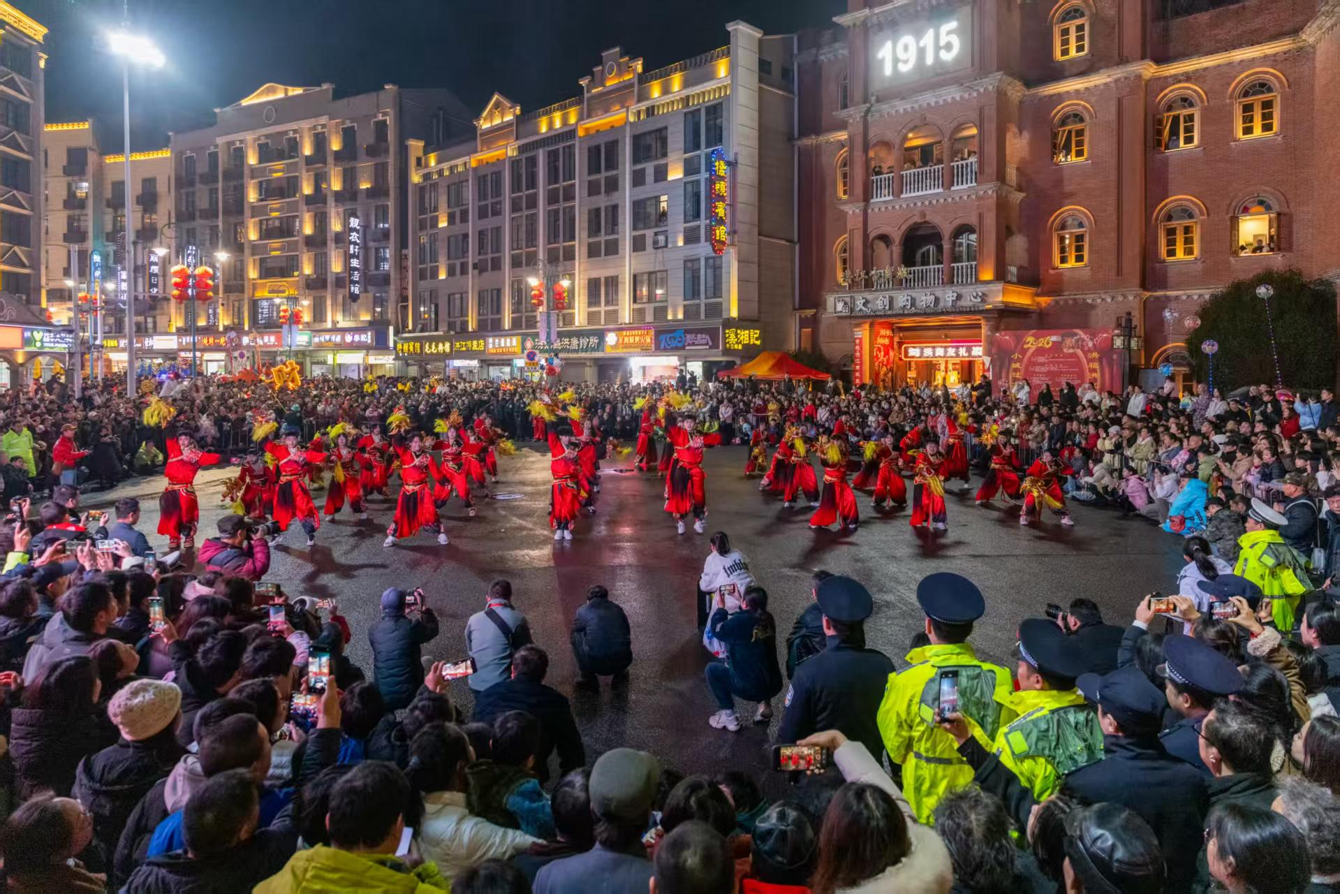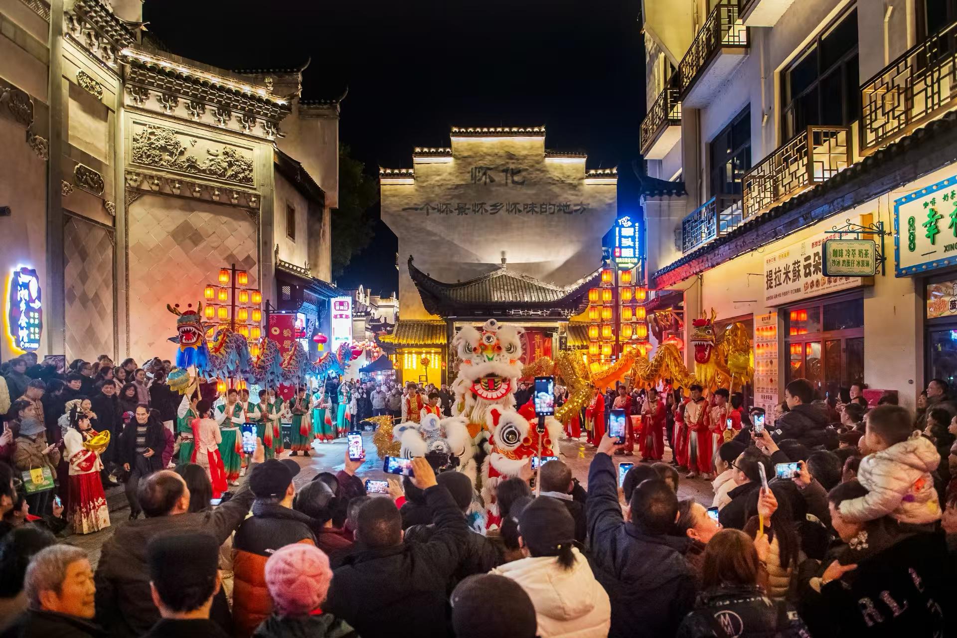 3月3日,元宵节,怀化洪江古商城锣鼓铿锵、人声鼎沸,“洪福洪江年·小城过大年”系列活动“元宵喜送龙”举行。数万游客与市民齐聚千年商城,与龙队亲密互动,观看龙过火、送龙飞升、龙狮巡游等传统仪式和表演,沉浸式感受洪商文化的深厚底蕴,共度元宵。