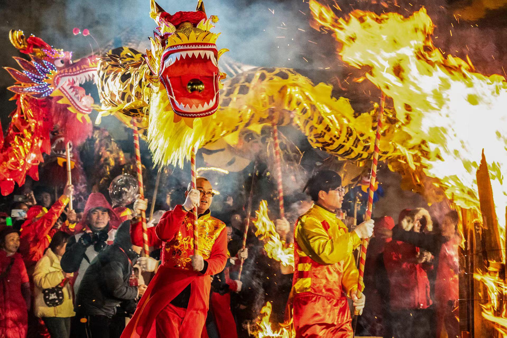 “祥龙过火,送龙飞升!”洪江区体育广场已是人山人海。令人期待的“龙过火”环节激情上演,这是洪江古商城“元宵喜送龙”最具辨识度的传统仪式。广场上,篝火熊熊燃烧,舞龙队员互相配合,挥舞着祥龙从火盆上空腾跃而过。精彩的舞龙表演再次点燃现场,欢呼声、锣鼓声震彻洪江古商城上空。