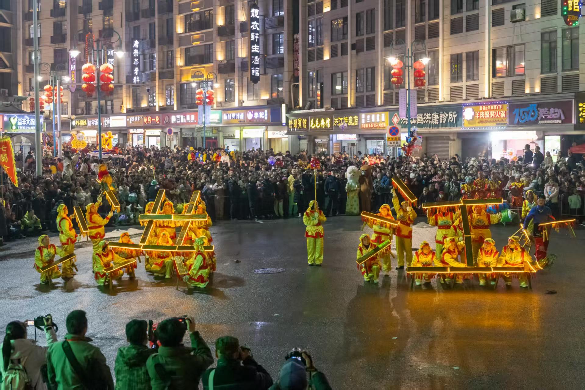 “摸龙身,行大运!”早已在新民路传统风情街等候的游客和市民,纷纷参与“摸龙”“钻龙”“扯龙”互动,期盼新年走鸿运。穆桂英方队、花棍方队、花灯队、手持龙队、彩龙船、踩高跷等特色队伍惊艳亮相。穆桂英方队英姿飒爽、气势昂扬,尽显巾帼风采;花棍方队步伐整齐、花棍翻飞,灵动美妙;花灯队流光溢彩,在夜色中熠熠生辉,勾勒出浪漫年味;手持龙队队员手持彩龙舞动,与长龙遥相呼应。民俗韵味与市井烟火在新民路街道交相辉映,引得游客与市民围观拍照,整条街道沉浸在喜庆祥和的节日氛围中。
