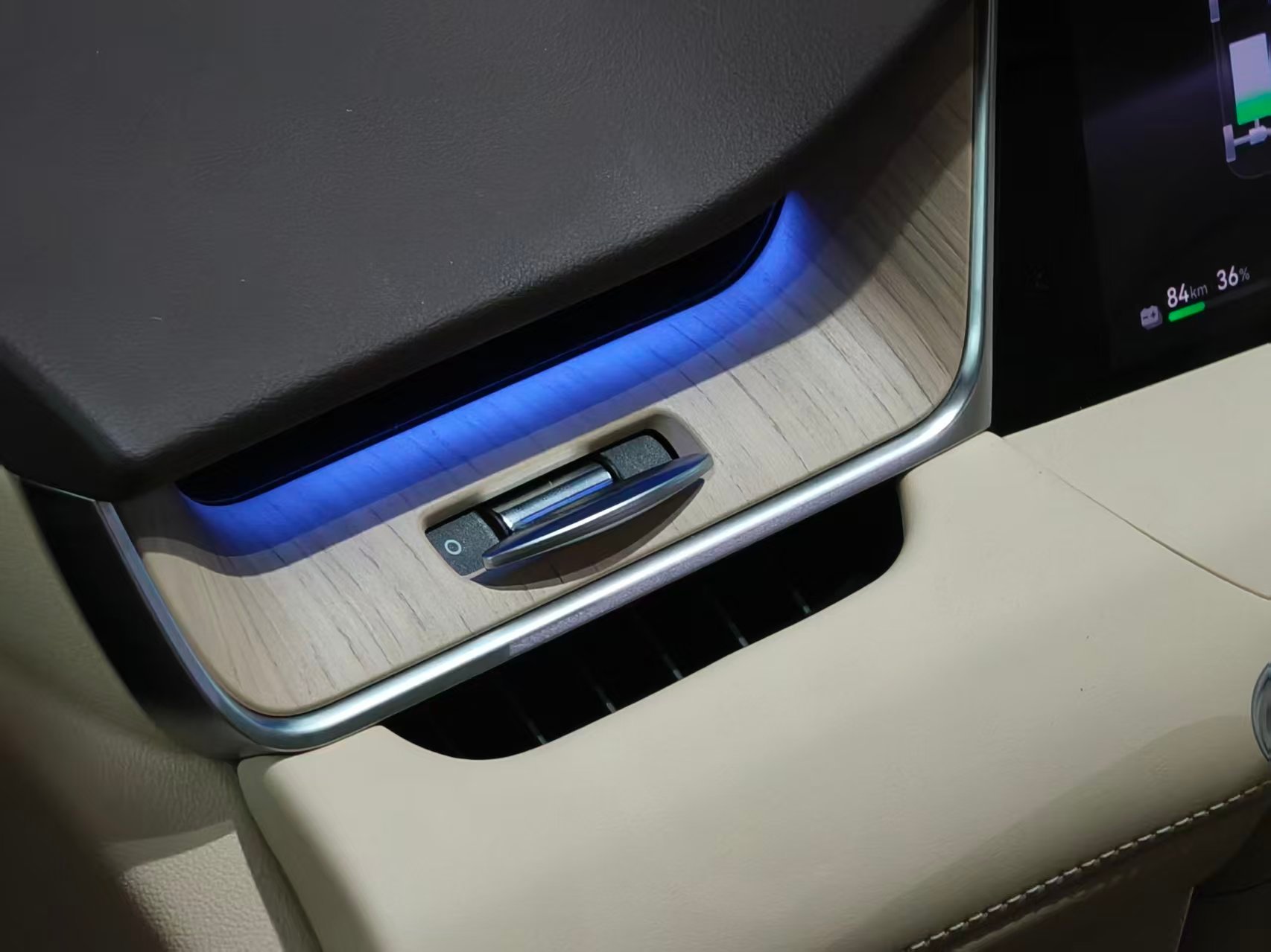 尚界H5这个出风口做的蛮精致的,淡淡的氛围灯光打在木饰板上,摸一下上面还是凹凸不