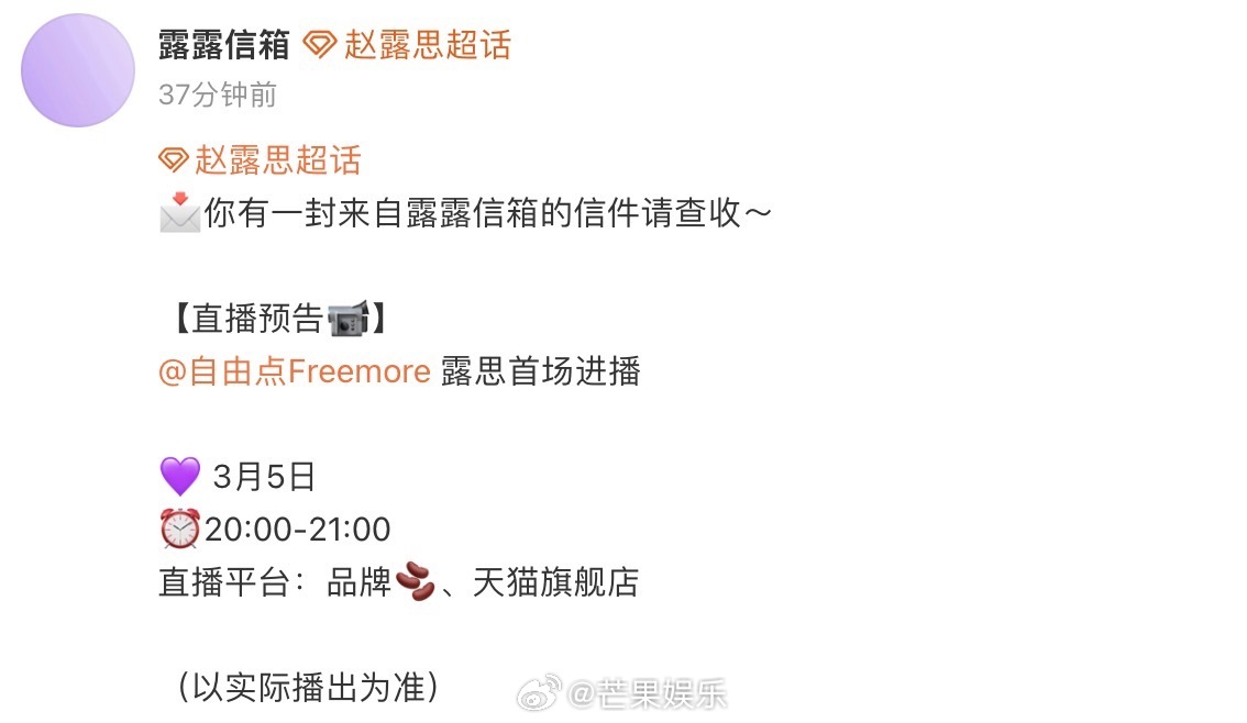 所有人锁定3月5日晚八点的自由点直播间自由点美商情商双在线👌花絮里的露思也太真实太可爱了,完全就是俏皮灵动的小公主来的!超级期待明天3月5号露思的直播!还有解锁隐藏小卡(还没有看过新小卡的一定会后悔)!不得不说,自由点是真会啊,大家明天直播间不见不散!!!赵露思自由点赵露思自由点品牌全球代言人赵露思的可露丽赵露思同款卫生巾