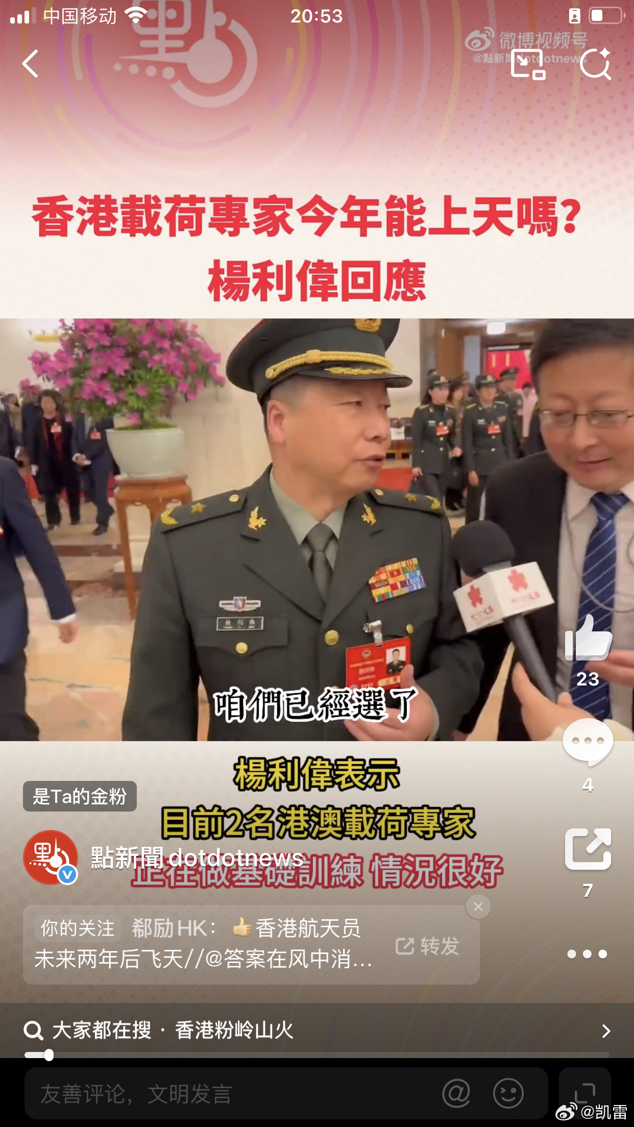见到太空人杨利伟还是这么瘦,问了他三个问题。香港太空人什么上太空,港澳太空人有没有数量增加最后一个问题,首批14个太空人停航停训,他们是不是在当教练? 明天见报,欢迎杨利伟再访港,包括培侨中学,他曾经在学校种了一颗树,香港没有冬天,今天亭亭如盖。 大文看两会 两会观察团 第一视角看两会