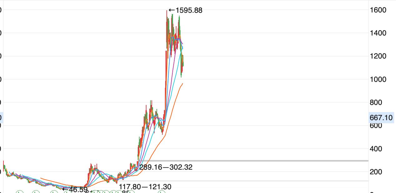估计没有多少人记得这个股票上市时歌舞升平了,20年过去了,中国石油又接近14元了,但是离发行价还差2元多,不知道40元以上追高买的那部分股民还有多少拿着? 寒王5年20倍的涨幅和中石油20年剩下30%的走势形成鲜明的对比,这就是科技和传统行业的估值差别,也是导致另外一个股票摩尔线程一上市就逼近1000元的原因,摩尔线程会复制寒王的成功走势还是复制中国石油的走势? 感觉够呛,摩尔线程无论是定价还是估值都偏高了,要重新走回1000元估计很难,反而很可能先2跌破100元。