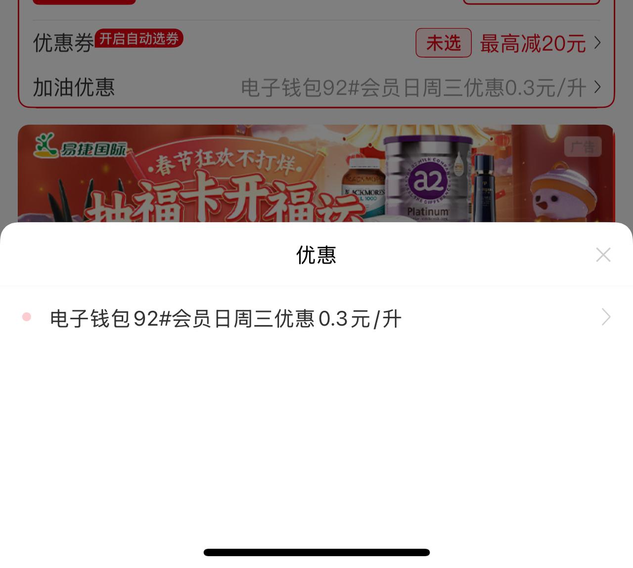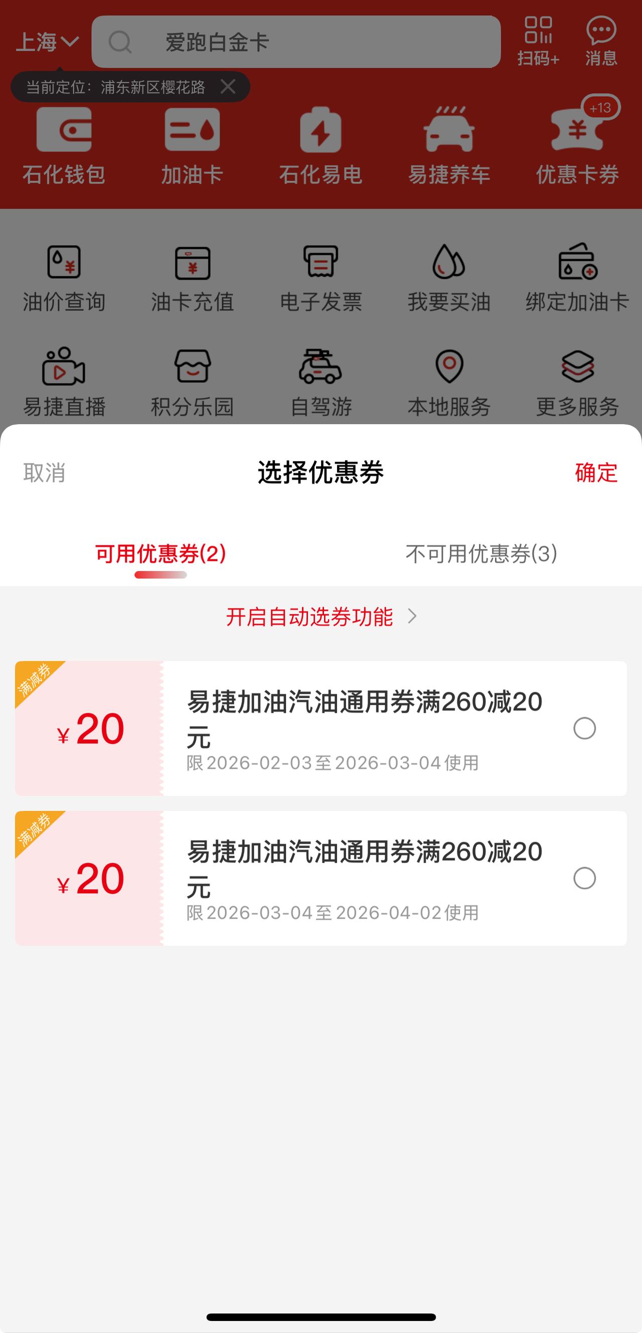 今天收到中石化的短信:“尊敬的客户您好,共有1张油品满减券与1张高标号油品满减券等待您的使用。仅限上海中国石化加油站使用,具体使用规则请登录易捷加油APP,点击券规则查看”。这才发现中石化会经常发加油优惠券,以前居然都没有用,过期好多张。一想现在美伊打了起来,3月9日下一次油调价肯定是上涨,正好去加油。 加油站车不多,不用排队直接就加上了。优惠券使用很简单,使用易捷加油程序时,直接在石化钱包下面选择对应的优惠券,加油时达到一定金额可以直接抵扣。今天还正好是周三会员日,又优惠了0.3元/升。如果有浦发信用卡的话,每周六上午10点充值满200还会立减16.6。 现在92号汽油为7.04元,95号汽油为7.49元,加了39升油优惠了35元,还算不错。