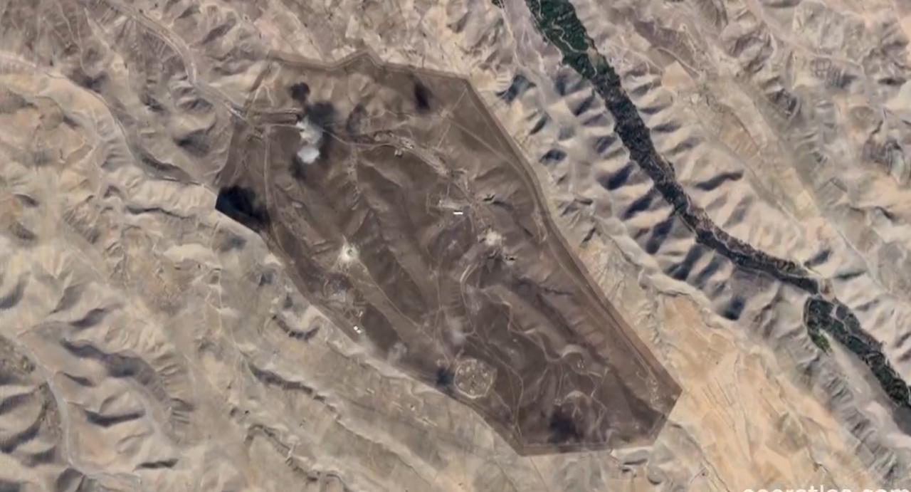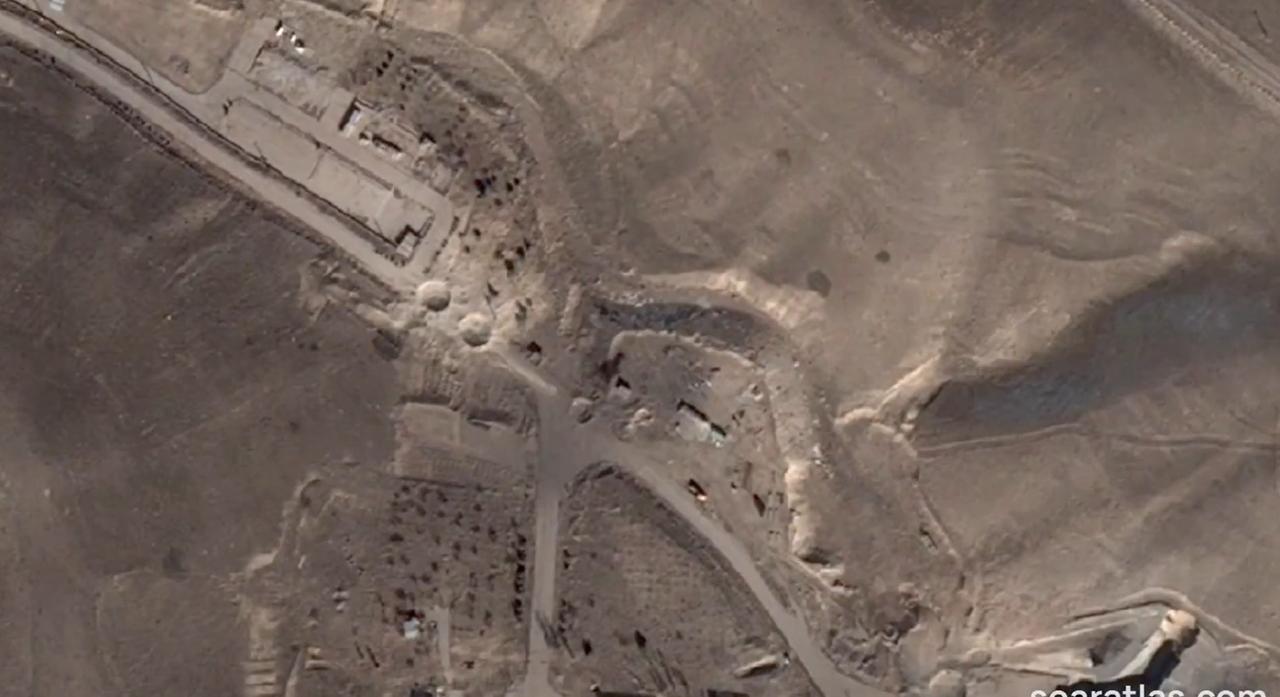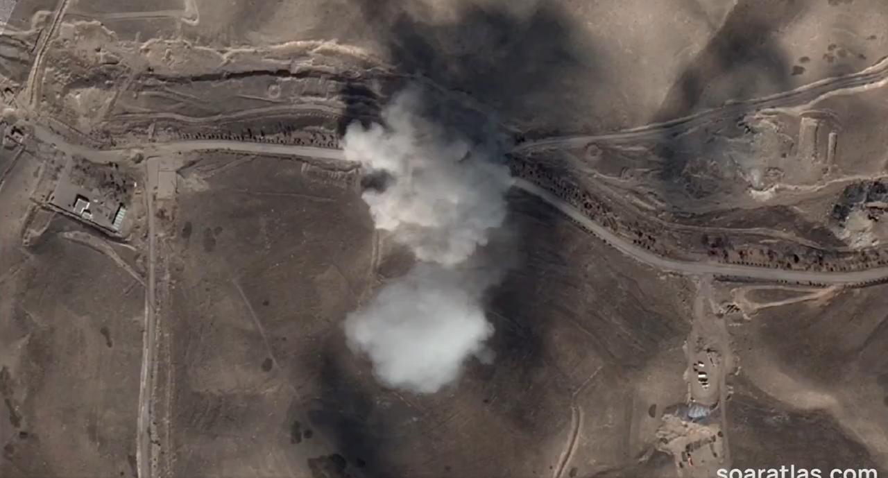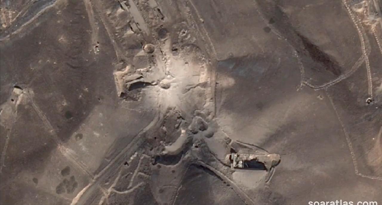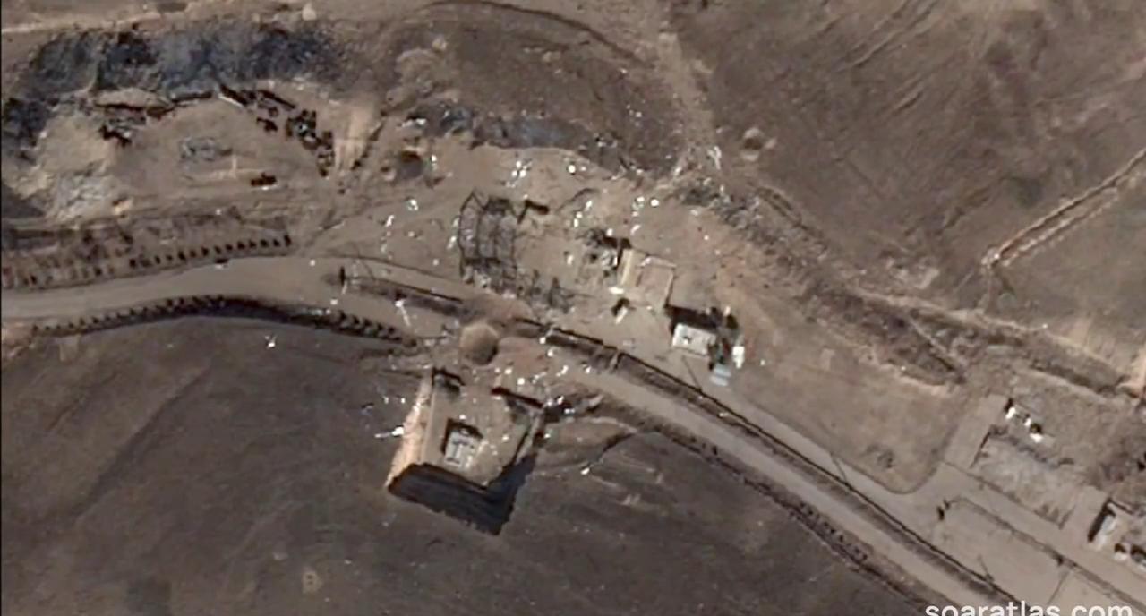 Soar Atlas 获得了 3 月 3 日拍摄的伊朗大不里士导弹基地的最新高分辨率卫星图像 可以看到最近一次撞击产生的大片尘埃云,现场散布着多个弹坑,雷达罩也明显受损。这张地图上有很多细节值得探索,东部的建筑似乎完全被掏空了。