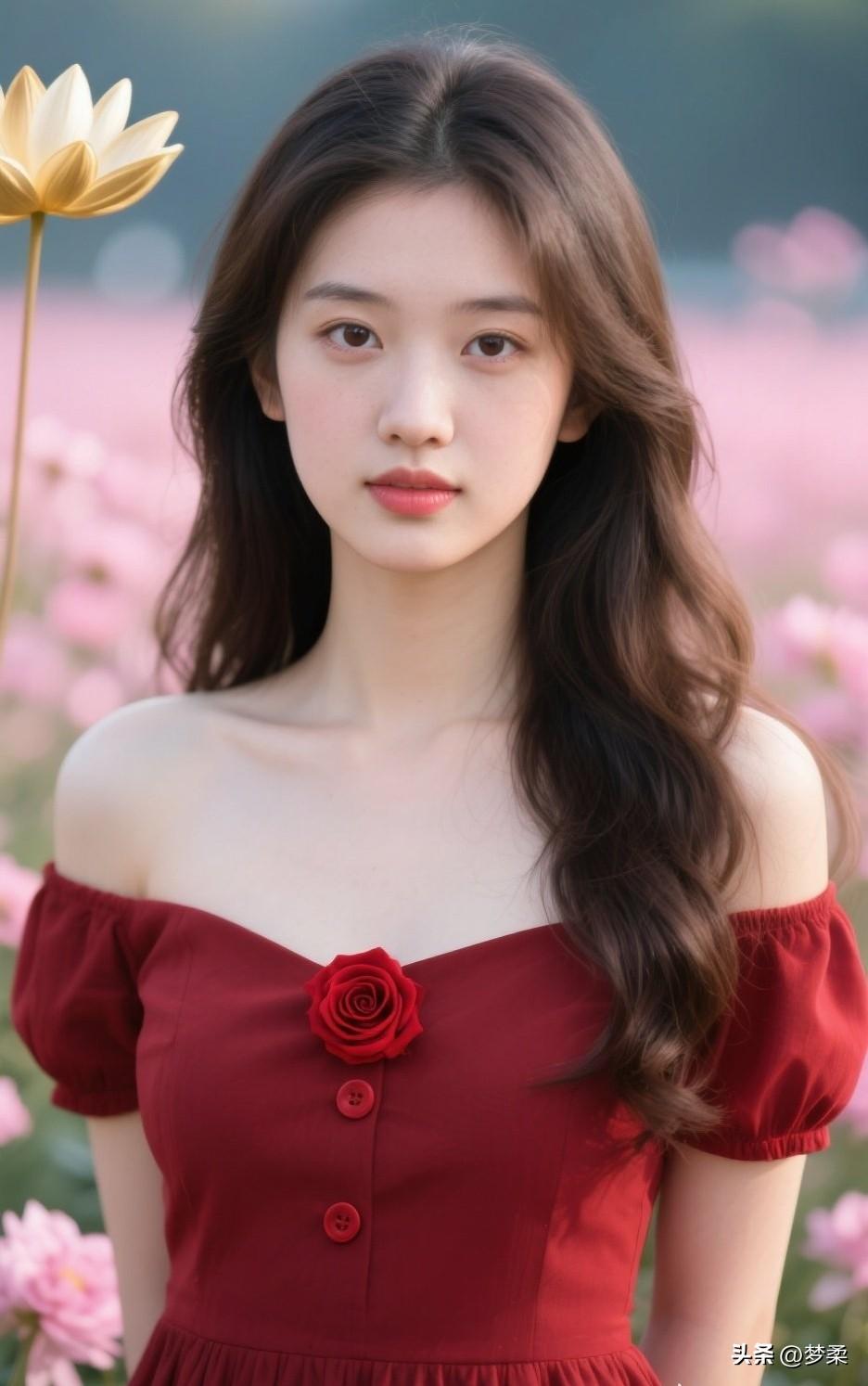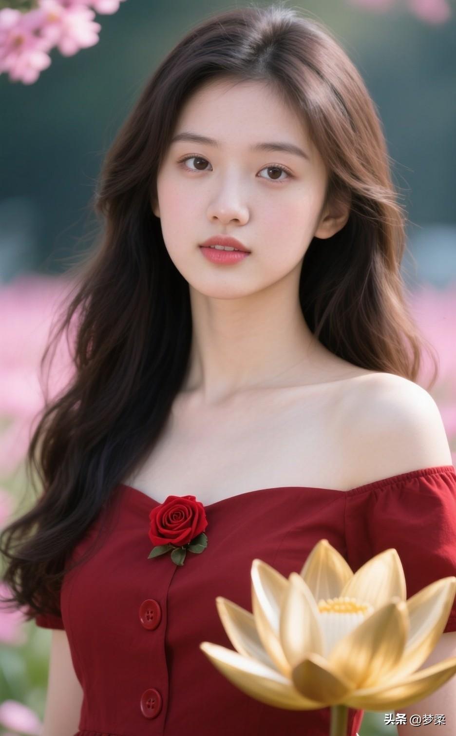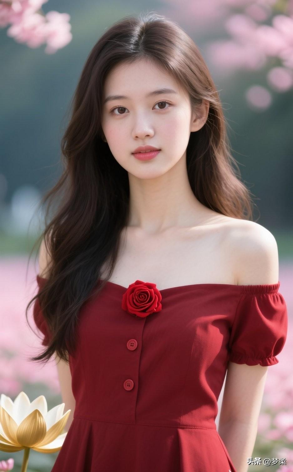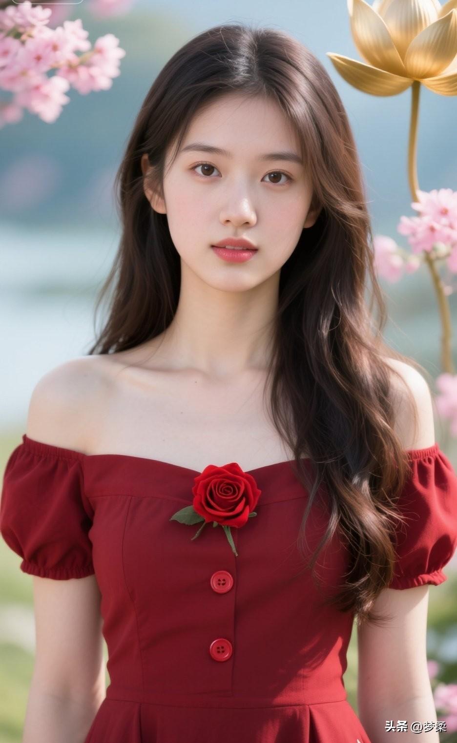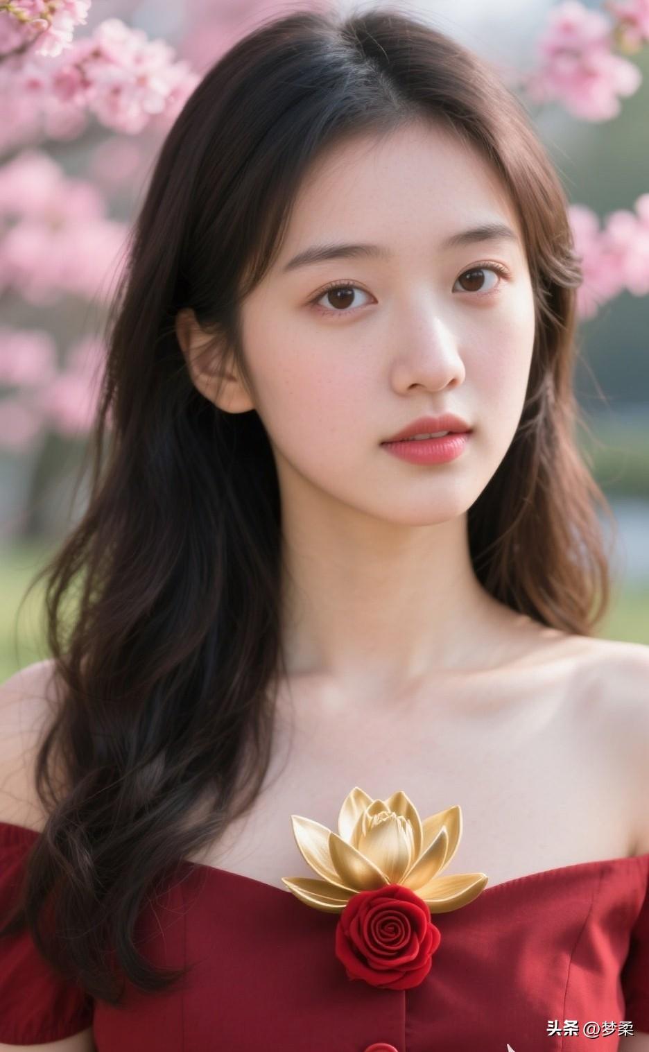 红衣少女与粉樱相映,浪漫气息扑面而来