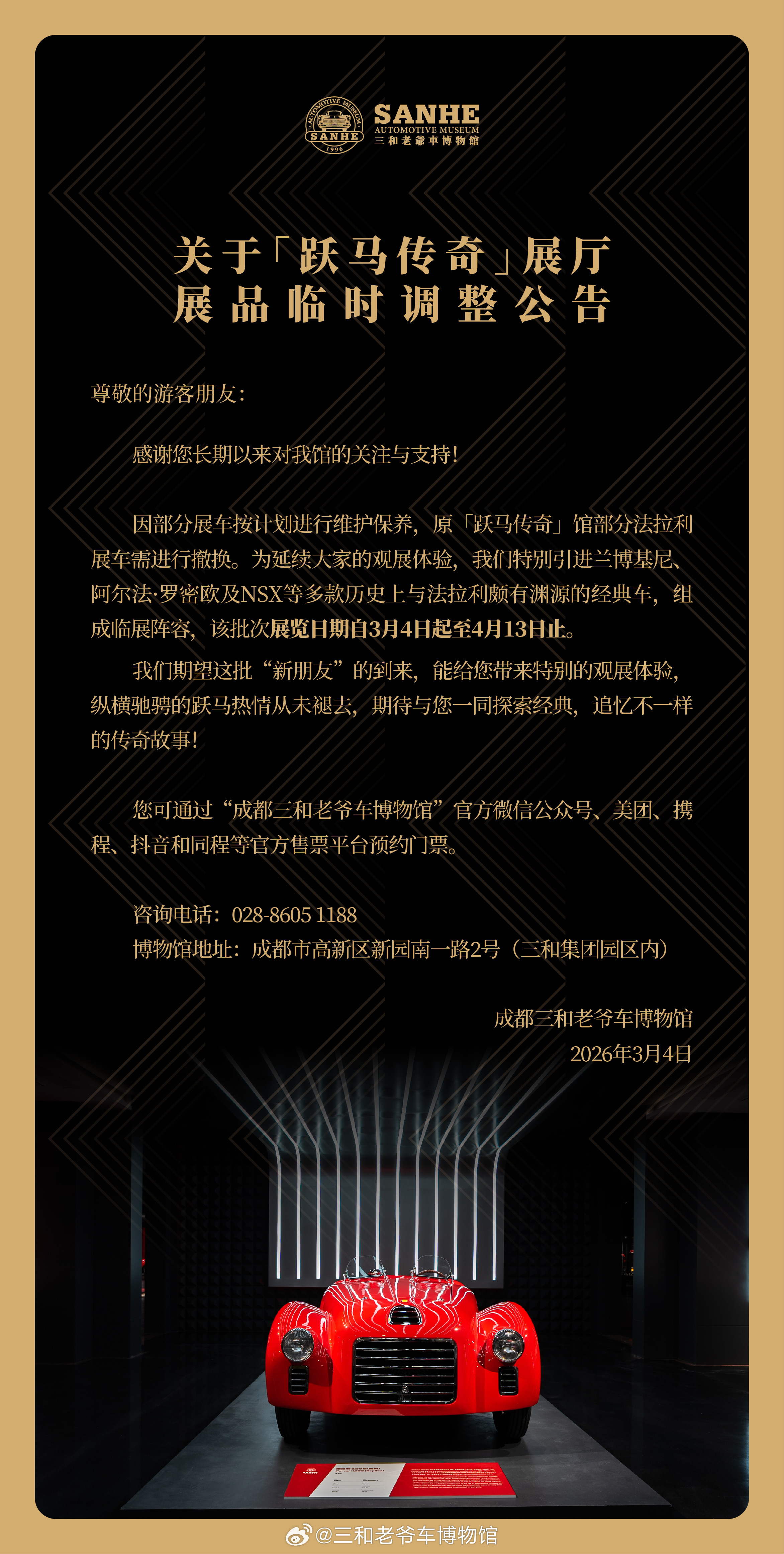 因部分展车按计划进行维护保养,原「跃马传奇」馆部分法拉利展车需进行撤换。为延续大家的观展体验,我们特别引进兰博基尼、阿尔法.罗密欧及NSX等多款历史上与法拉利颇有渊源的经典车,组成临展阵容,该批次展览日期自3月4日起至4月13日止。