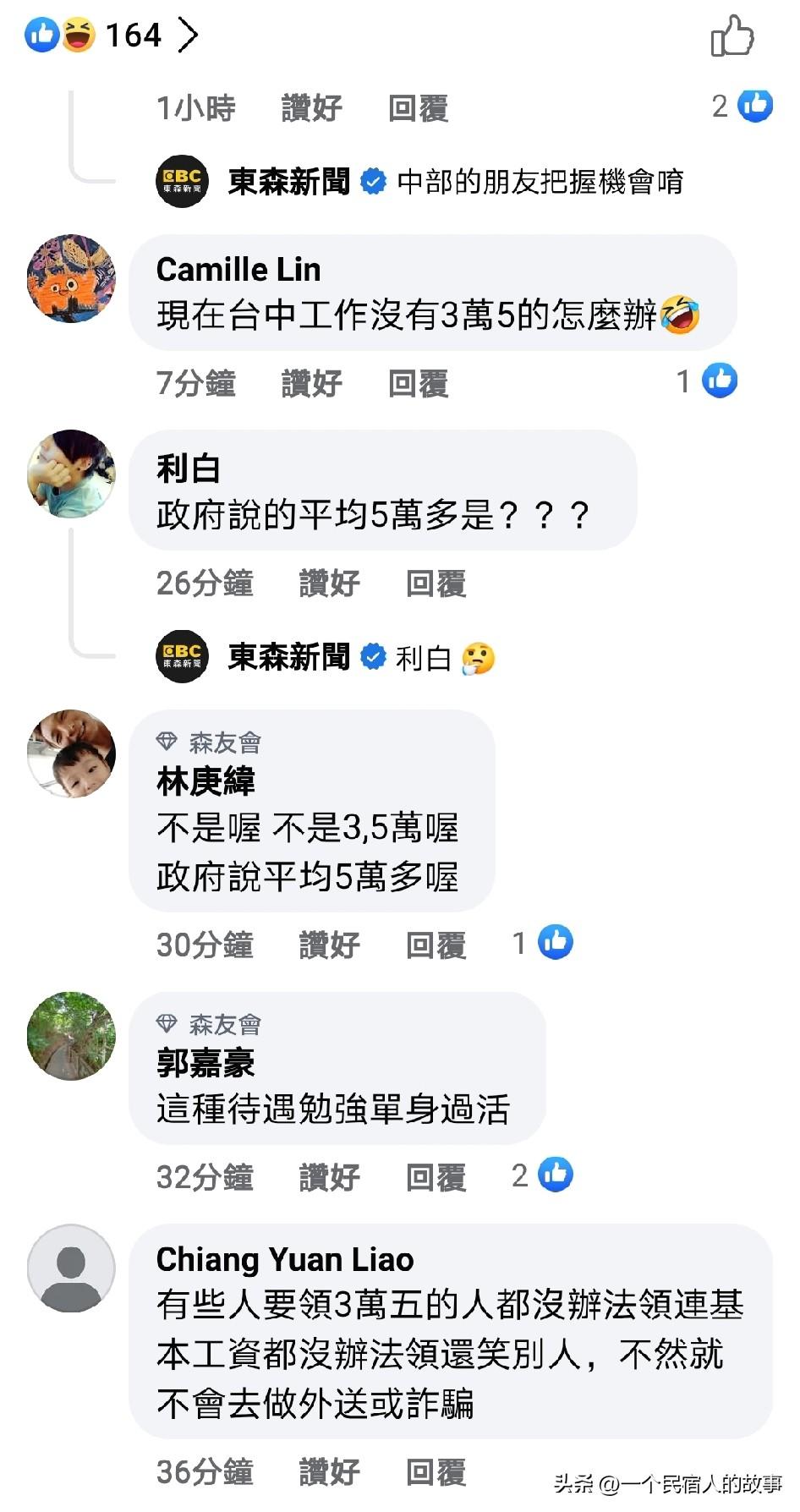 台湾月薪5万都是扯淡!别被骗了! 这两天岛内台中市为解决青年就业问题,联合14家企业提供了400多个就业岗位,平均月薪3.5万台币(约合7600人民币)!实事求是说,这月薪比大陆工资高很多,但要知道台湾当局和民进党吹嘘台湾月薪都五六万,但事实上,很多人也拿不到3.5万台币的工资,更别提官方公知吹嘘的五六万了,评论区台湾网友也都在吐槽他们拿不到3万5。 所有没必要羡慕吹捧任何地方,实事求是改变自己就好了。
