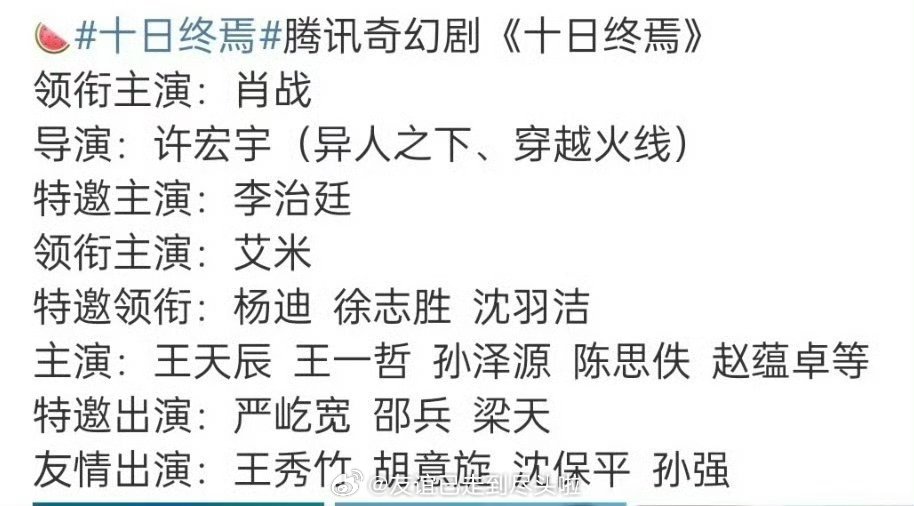 🍉腾讯奇幻剧《十日终焉》领衔主演:肖战导演:许宏宇(异人之下,穿越火线)特邀主演:李治廷领衔主演:艾米特邀领衔:杨迪,徐志胜,沈羽洁主演:王天辰,王一哲,孙泽源,陈思佚,赵蕴卓等特邀出演:严屹宽 邵兵 梁天友情出演:王秀竹,胡意旋,沈保平,孙强