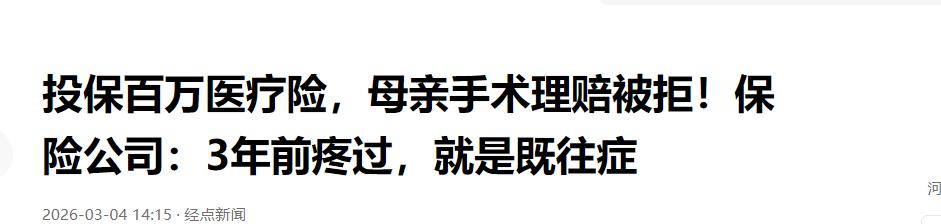 “保险公司玩不起!”河北,男子在网上为母亲购买一份一年期百万医疗保险,每月支付99.9元,一年1198.8元,合同约定,住院费用扣除1万元免赔额后和100%报销。医保外费用扣除1万元免赔额后报销50%。之后老人住院做手术,花费超过6万。保险公司却因为老人三年前病历上写过的一句腿疼,拒绝赔付。男子拨打维权热线。保险公司却给出两个处理方案,男子不能接受。 河北涞水县法院的大厅里,刘先生正准备通过法律途径,为母亲讨一个公道。他要起诉众安在线财产保险公司,不为别的,就为给69岁的老母亲讨回那笔该得的1.2万元理赔款。 可保险公司的工作人员在一堆检查单中,硬生生找出了一句“右侧髋部疼痛三年”,就凭这六个字,直接认定老人投保前就已患病,属于“既往症”,干脆利落地拒绝了所有赔付。 事情要从2025年9月说起。当时,刘先生看着年近七旬的母亲,心里总惦记着给老人添份保障,多方比对后,选了众安保险的“惠医保”普惠百万医疗险。 一年保费1198.8元,合同上把各项费用的报销比例写得清清楚楚。那一刻,刘先生和家人都松了口气,觉得这笔钱花得值,能给老人的晚年生活添个兜底,真要是得了大病,也能少些为难。 变故发生在2026年1月。刘先生的母亲在北京医院被确诊为股骨头无菌性坏死,病情发展得很快,确诊没多久就做了手术。 住院加手术的费用,前前后后花了6万多,扣除医保报销的部分,刘先生自己掏了3万多。 按照当初的保单约定,保险公司本该赔付1.2万元,这也是刘先生当初投保的初衷。 可刘先生把理赔申请交上去后,等来的却是保险公司对病历的逐字逐句审查。保险公司抓着“疼痛”这个主观感受,硬将其等同于发病证据,拒绝赔付。 2026年3月,刘先生多次尝试维权。保险公司给出的处理方案更像是一种“私了”。要么退还保费并解除合同,双方彻底两清。要么给2000元补偿款结案,但保单立刻终止,以后治疗这个病的费用公司再也不管。 刘先生想都没想就拒绝了。在他看来,保险理赔是严肃的医学和法律问题,不是菜市场买菜,能讨价还价。 母亲投保的时候,根本没有任何医院给出过“股骨头无菌性坏死”的诊断结论,更不可能提前预知自己将来会得这个病、要做手术。 对于近七旬的老人来说,腰腿、髋部偶尔疼一疼太常见了,这就是正常的身体体感,和确诊股骨头坏死这种特定大病,根本不是一回事。 根据行业监管要求,判定“既往症”有两个硬性前提。一是已患病,二是已知晓。刘先生是在互联网平台上买的保险,整个过程只有点击确认。 如果保险公司在投保时没有把相关定义解释清楚,事后就不该玩弄文字技巧,把拒赔的理由强加在消费者头上。 其实,这种纠纷在当前的保险行业并不少见。现在不少保险公司,习惯在理赔环节“钻细节”,想方设法把投保人投保前的任何身体不适,都往“既往症”上靠,目的就是降低自己的赔付成本,可这样做,伤的是消费者对保险行业的信任。 刘先生选择走进法院,不仅是为了那1.2万元,更是想弄明白一个道理:判定生病的标准,到底应该依据医学诊断,还是握在保险公司的精算师手里? 如果连“身体疼痛”这种主观体感,都能成为保险公司万能的拒赔理由,那百万医疗险的保障意义,也就荡然无存了。 人们买保险,买的是一份安心,是万一遭遇疾病时的底气,而不是在承受病痛折磨、背负经济压力的同时,还要额外应对一份拒赔通知书。 法律,理应给保险公司这种随意解读条款、滥用拒赔权利的行为,划一道清晰的红线。毕竟,保险的本质是保障,不是算计。 信息来源:《投保百万医疗险,母亲手术理赔被拒!保险公司:3年前疼过,就是既往症》,经点新闻,2026年3月4日。