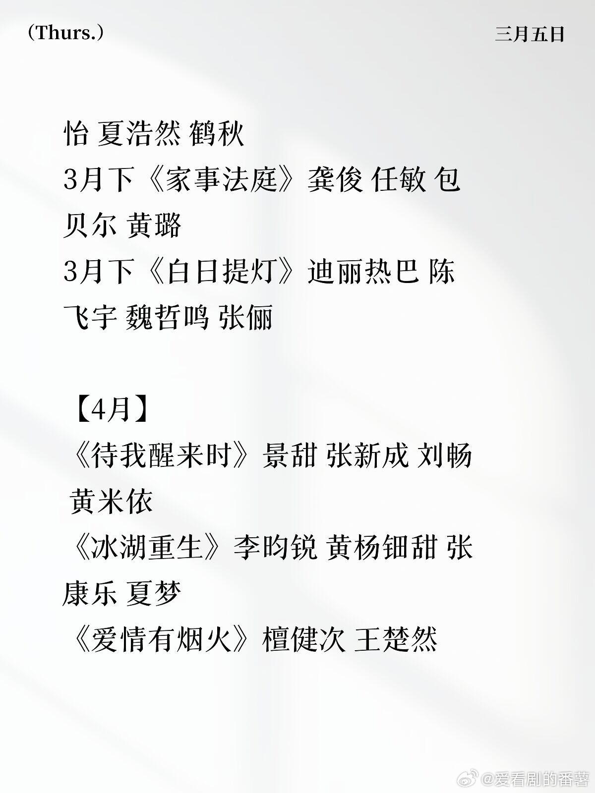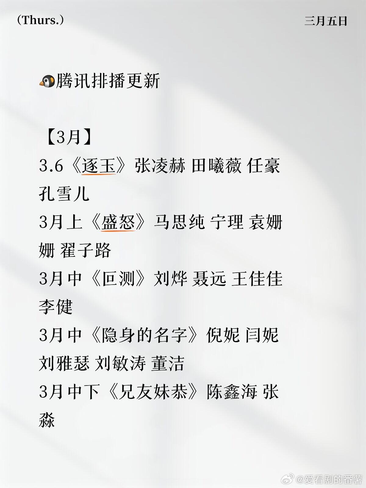 🐧腾讯排播更新【3月】3.6《逐玉》张凌赫 田曦薇 任豪 孔雪儿3月上《盛怒》马思纯 宁理 袁姗姗 翟子路3月中《叵测》刘烨 聂远 王佳佳 李健3月中《隐身的名字》倪妮 闫妮 刘雅瑟 刘敏涛 董洁3月中下《兄友妹恭》陈鑫海 张淼怡 夏浩然 鹤秋3月下《家事法庭》龚俊 任敏 包贝尔 黄璐3月下《白日提灯》迪丽热巴 陈飞宇 魏哲鸣 张俪【4月】《待我醒来时》景甜 张新成 刘畅 黄米依《冰湖重生》李昀锐 黄杨钿甜 张康乐 夏梦《爱情有烟火》檀健次 王楚然《蜜语纪》钟汉良 朱珠 李梦 经超《方圆八百米》许凯 丁勇岱 邓恩熙《小芳出嫁》王影璐 辛云来 颖儿 范明