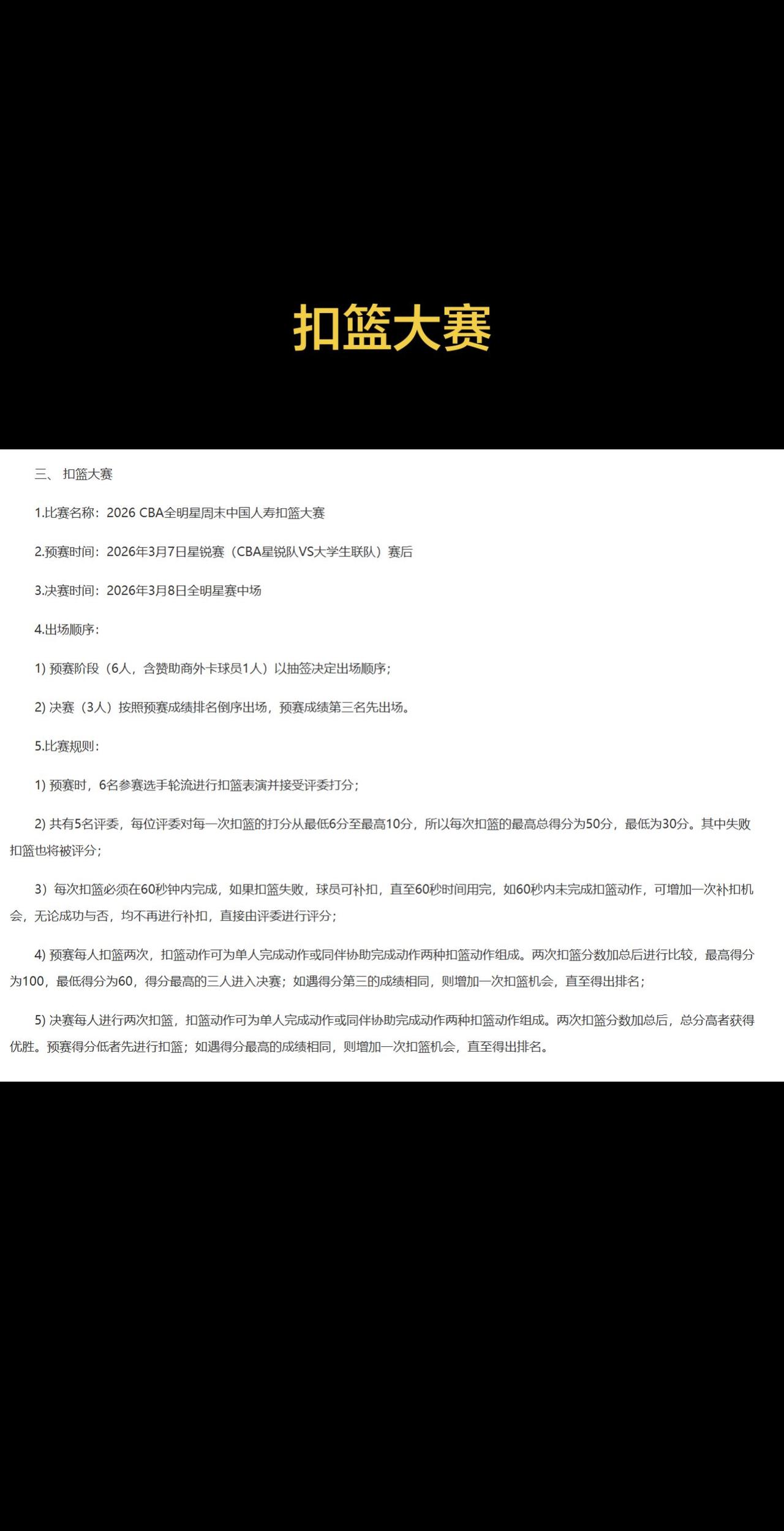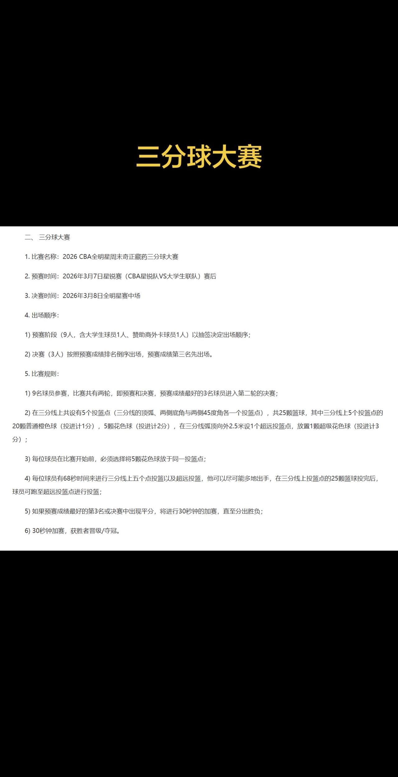一、 技巧挑战赛 1.比赛名称:2026年CBA全明星周末李宁技巧挑战赛 2.预赛时间:2026年3月7日星锐赛(CBA星锐队VS大学生联队)赛后 3.决赛时间:2026年3月8日全明星赛中场休息时 4.出场顺序: 1)预赛阶段共8名球员(含赞助商外卡球员1人)抽签决定出场顺序; 2)决赛阶段(4人)按照预赛计时排名成绩倒序出场,预赛排名第四名先出场。 5.比赛规则: 1)比赛动作流程设置按照中国篮球协会篮球技能等级评定十级测试方法; 2)比赛采用罚时制规则:技术考核环节每出现一次错误,在基础完成时间上加罚2秒;三分球投篮每投失一次,加罚3秒。最终排名以球员完成全部规定动作的总用时为依据,预赛用时最短的4名球员进入决赛阶段; 3) 以裁判哨音为准开始比赛,球员从指定位置出发依次进行如下技巧挑战环节: ①迎上防守→②侧滑步→③错位防守(防强侧无球队员抱防)→④弱侧协防(防弱侧无球队员敞防)→⑤急停突破→⑥双手胸前传球→⑦急停突破→⑧右手低手上篮→⑨左手低手上篮→⑩背筐急停转身投篮(右左各一次,投篮不中需补篮命中)→⑪罚球线投篮(投篮不中需补篮命中)→⑫体前变向运球→⑬胯下运球→⑭背后运球→⑮后转身运球→⑯三分投篮三次(无需补篮) 4)决赛中用时最短者成为2026年CBA全明星周末李宁技巧挑战赛冠军。 、 三分球大赛 1. 比赛名称:2026 CBA全明星周末奇正藏药三分球大赛 2. 预赛时间:2026年3月7日星锐赛(CBA星锐队VS大学生联队)赛后 3. 决赛时间:2026年3月8日全明星赛中场 4. 出场顺序: 1) 预赛阶段(9人,含大学生球员1人、赞助商外卡球员1人)以抽签决定出场顺序; 2) 决赛(3人)按照预赛成绩排名倒序出场,预赛成绩第三名先出场。 5. 比赛规则: 1) 9名球员参赛,比赛共有两轮,即预赛和决赛,预赛成绩最好的3名球员进入第二轮的决赛; 2) 在三分线上共设有5个投篮点(三分线的顶弧、两侧底角与两侧45度角各一个投篮点),共25颗篮球,其中三分线上5个投篮点的20颗普通橙色球(投进计1分),5颗花色球(投进计2分),在三分线弧顶向外2.5米设1个超远投篮点,放置1颗超级花色球(投进计3分); 3) 每位球员在比赛开始前,必须选择将5颗花色球放于同一投篮点; 4) 每位球员有68秒时间来进行三分线上五个点投篮以及超远投篮,他可以尽可能多地出手,在三分线上投篮点的25颗篮球投完后,球员可跑至超远投篮点进行投篮; 5) 如果预赛成绩最好的第3名或决赛中出现平分,将进行30秒钟的加赛,直至分出胜负; 6) 30秒钟加赛,获胜者晋级/夺冠。 三、 扣篮大赛 1.比赛名称:2026 CBA全明星周末中国人寿扣篮大赛 2.预赛时间:2026年3月7日星锐赛(CBA星锐队VS大学生联队)赛后 3.决赛时间:2026年3月8日全明星赛中场 4.出场顺序: 1) 预赛阶段(6人,含赞助商外卡球员1人)以抽签决定出场顺序; 2) 决赛(3人)按照预赛成绩排名倒序出场,预赛成绩第三名先出场。 5.比赛规则: 1) 预赛时,6名参赛选手轮流进行扣篮表演并接受评委打分; 2) 共有5名评委,每位评委对每一次扣篮的打分从最低6分至最高10分,所以每次扣篮的最高总得分为50分,最低为30分。其中失败扣篮也将被评分; 3)每次扣篮必须在60秒钟内完成,如果扣篮失败,球员可补扣,直至60秒时间用完,如60秒内未完成扣篮动作,可增加一次补扣机会,无论成功与否,均不再进行补扣,直接由评委进行评分; 4) 预赛每人扣篮两次,扣篮动作可为单人完成动作或同伴协助完成动作两种扣篮动作组成。两次扣篮分数加总后进行比较,最高得分为100,最低得分为60,得分最高的三人进入决赛;如遇得分第三的成绩相同,则增加一次扣篮机会,直至得出排名; 5) 决赛每人进行两次扣篮,扣篮动作可为单人完成动作或同伴协助完成动作两种扣篮动作组成。两次扣篮分数加总后,总分高者获得优胜。预赛得分低者先进行扣篮;如遇得分最高的成绩相同,则增加一次扣篮机会,直至得出排名。