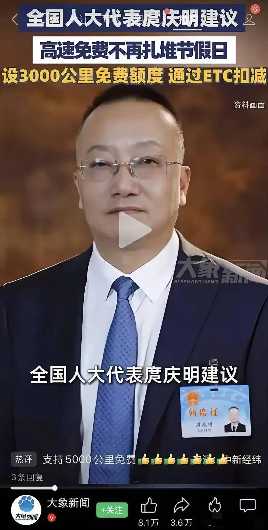 好消息!好消息!全国人大代表庹庆明提出建议:取消节假日高速免费政策,改为给每辆车每年发放3000公里的免费通行额度,通过ETC自动扣减,你赞同吗? 我一看这建议,第一反应是拍大腿:早该这么干了!这些年节假日出门,免费是免费了,可堵在高速上动弹不得,那叫一个遭罪。去年国庆我老表从杭州回老家,平时4小时的路,硬是开了11个小时,憋得他在车上直骂娘。 庹代表算了一笔账,我念给你听听。2012年全国民用汽车才1.2亿辆,现在多少?3.63亿辆!去年国庆8天,公路跑了22.48亿人次,多地高速车流量创历史新高。这么多人挤一块儿出门,不堵才怪。 大家吐槽的从来不是免费本身,而是免费带来的连锁糟心体验。节假日高速一免费,全中国的车都往一条路上挤,平时畅通的主干道能直接变成露天停车场,有人在高速上遛狗、打羽毛球,甚至支起小桌子煮火锅,看似热闹,背后全是无奈。不少车主算过一笔实在账,省下百八十块过路费,多烧几百块油钱,再搭上大半天时间,里外里亏得更多。 这项建议刚上热搜,网友的评论就炸开了锅。支持的人占了大多数,常年节假日值班的医护、交警、服务行业从业者说,终于不用看着别人免费出行自己干瞪眼,3000公里额度想什么时候用就什么时候用,福利真正落到自己身上。经常跑长途的货车司机家属也表态,私家车错峰出行,高速车流更均匀,大件物流和应急通道也能更顺畅。 也有不少人提出实实在在的顾虑。有人觉得3000公里额度不够用,跨省回家一趟就要上千公里,一年跑几趟就见底。还有人担心政策一变,原本全民都能享受到的假日福利,变成少部分高频用车人群的专属。更有车主担心ETC系统升级不到位,扣减里程出错、额度清零不透明,最后反而添新麻烦。 我必须把话说明白,这个建议不是要取消高速免费,而是把集中发放的福利拆成灵活可用的“出行红包”。按照目前私家车年均高速行驶里程测算,3000公里基本能覆盖大多数家庭一年的刚需出行,技术上依托全国联网的ETC系统,自动扣减、精准核算,完全不需要车主额外操作。代表还提到可以给新能源车额外增加免费里程,既照顾绿色出行,也让政策更有温度。 现行的假日集中免费模式,已经跟不上3亿多汽车保有量的出行需求。车流量脉冲式爆发,不仅让道路不堪重负,还推高了事故发生率,耽误应急救援,这些隐性成本,远比减免的通行费要高。好的民生政策,不该让大家为了占便宜遭罪,更不该让坚守岗位的人错过福利。 一项好建议从提出到落地,还要经过数据测算、试点测试、意见征集等多个环节。3000公里额度是否合理,不同地区要不要差异化调整,系统改造如何保障公平透明,这些都需要一步步细化完善。高速费用减免 高速收费年限 高速新规解读 高速etc优惠 过年高速新规 etc高速缴费 智慧高速收费 南雄etc收费 你平时节假日出门堵过最长时间是多久?如果真的推行年度免费额度,你觉得3000公里够不够用?要不要给长途车主、多孩家庭适当增加额度?来评论区聊聊你的真实想法。