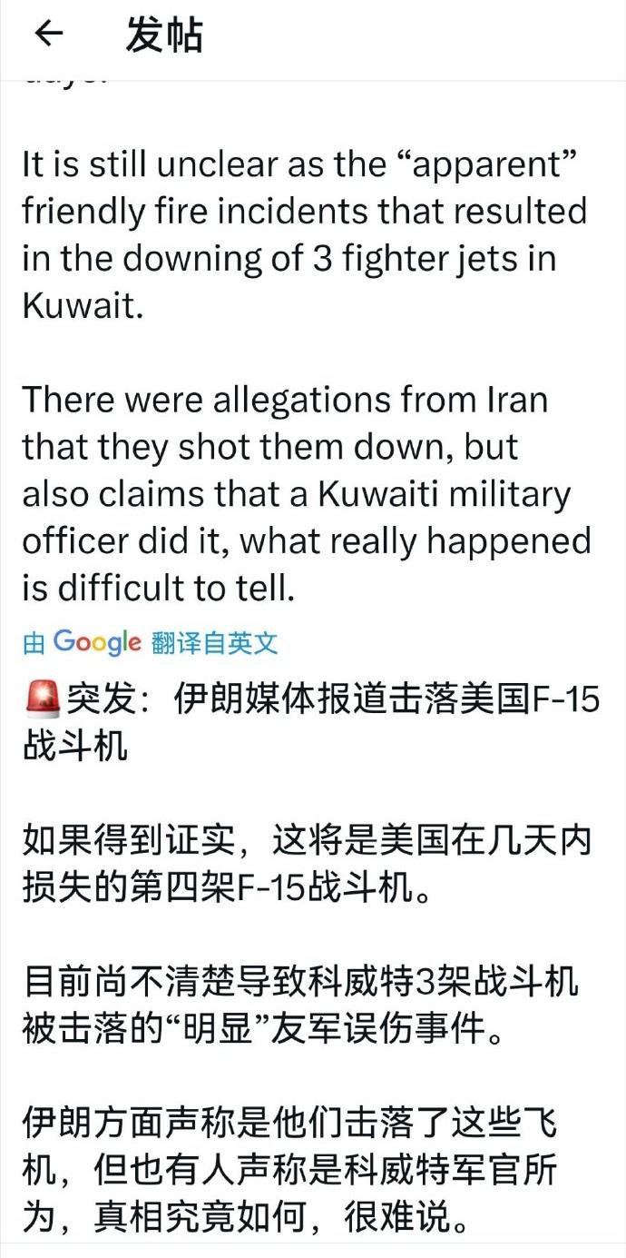 第4架F-15战斗机确认在伊朗西部坠毁,2位飞行人员全部弹射逃生后获救送往沙特苏丹王子空军基地。美国中央司令部将在稍后公布具体细节。以色列的消息3月5日出来的,其实昨天伊朗方面就宣布击落1架F-15,现在F-15机队已经有4架损失了,最开始美国不承认被击落说是被“爱国者”防空导弹系统误击,后来又说是被F/A-18误击,说法翻来覆去,反正宁愿把锅让友军背也不想和伊朗扯上任何关系。现在第4架直接在伊朗境内坠毁,这次看看美国人又要找什么原因。